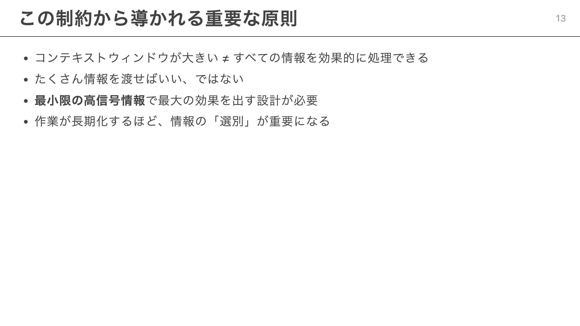 コンテキストウィンドウが大きい ≠ すべての情報を効果的に処理できる たくさん情報を渡せばいい、ではない 最小限の高信号情報で最大の効果を出す設計が必要 作業が長期化するほど、情報の「選別」が重要になる この制約から導かれる重要な原則 13