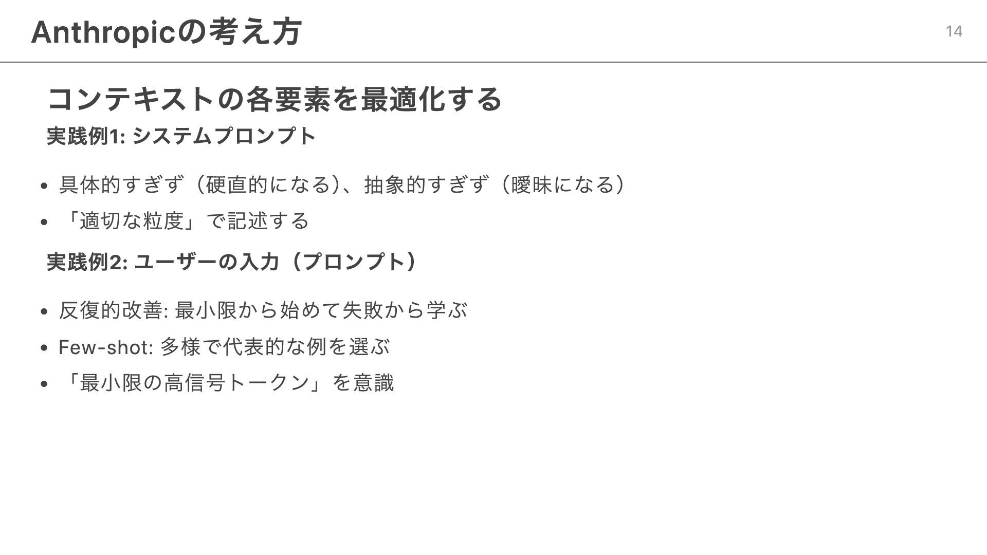 Few-shot: 多様で代表的な例を選ぶ 「最小限の高信号トークン」を意識 Anthropicの考え方 14
