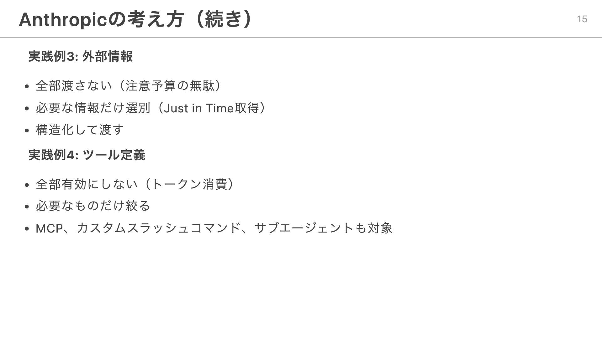 実践例3: 外部情報 全部渡さない(注意予算の無駄) 必要な情報だけ選別(Just in Time取得) 構造化して渡す 実践例4: ツール定義 全部有効にしない(トークン消費)