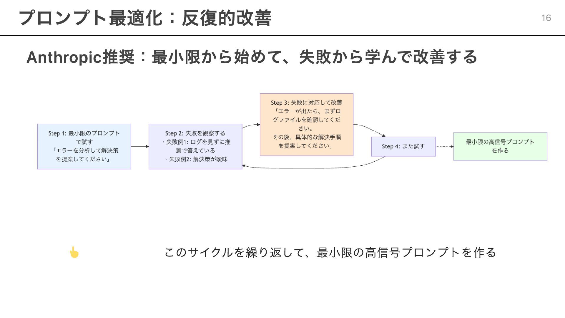 Anthropic推奨:最小限から始めて、失敗から学んで改善する このサイクルを繰り返して、最小限の高信号プロンプトを作る プロンプト最適化:反復的改善 16