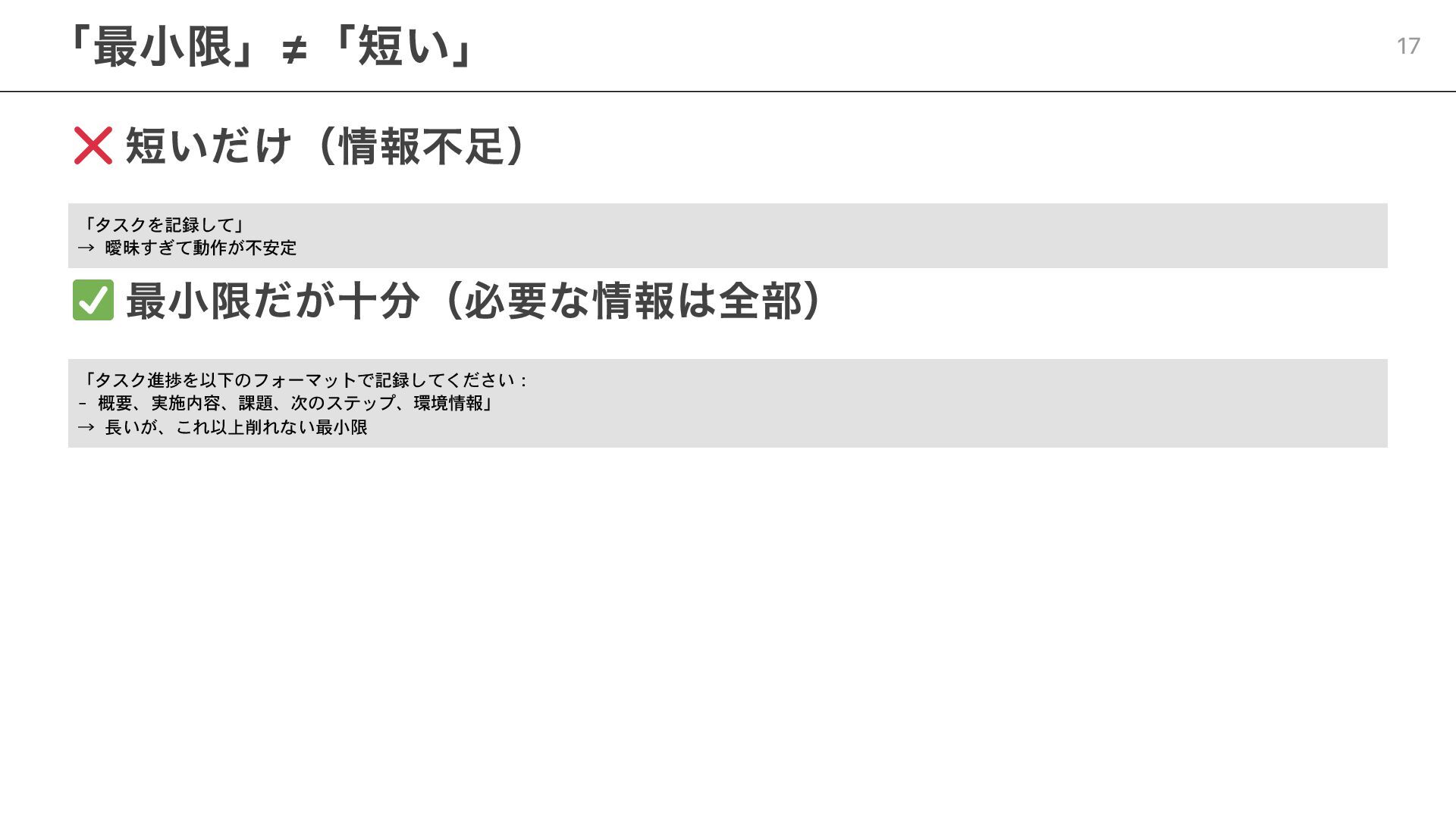 短いだけ(情報不足) 「タスクを記録して」 → 曖昧すぎて動作が不安定 最小限だが十分(必要な情報は全部) 「タスク進捗を以下のフォーマットで記録してください: - 概要、実施内容、課題、次のステップ、環境情報」 → 長いが、これ以上削れない最小限