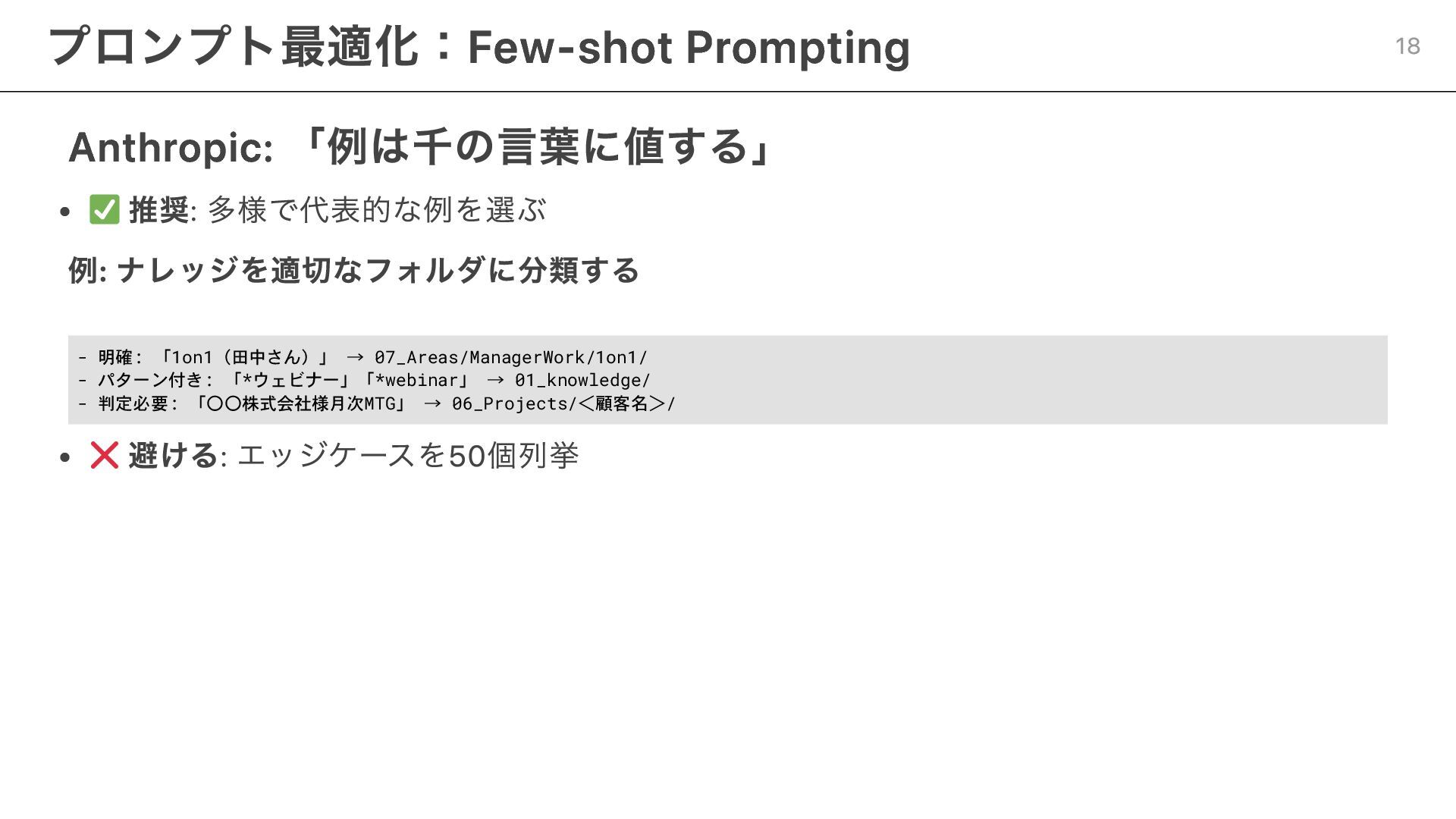 Anthropic: 「例は千の言葉に値する」 推奨: 多様で代表的な例を選ぶ 例: ナレッジを適切なフォルダに分類する - 明確: 「1on1(田中さん)」 →