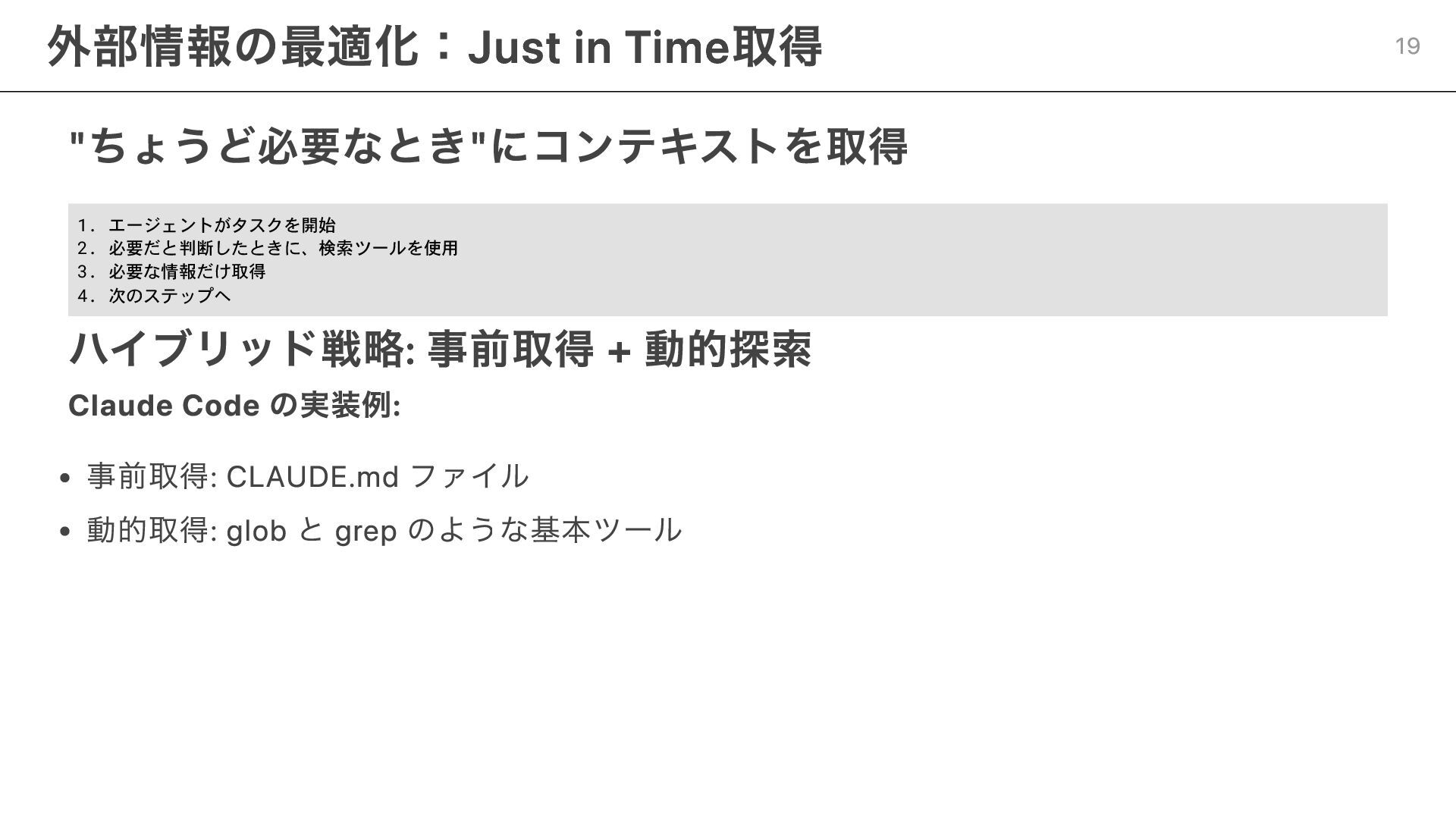 "ちょうど必要なとき"にコンテキストを取得 1. エージェントがタスクを開始 2. 必要だと判断したときに、検索ツールを使用 3. 必要な情報だけ取得 4. 次のステップへ ハイブリッド戦略: