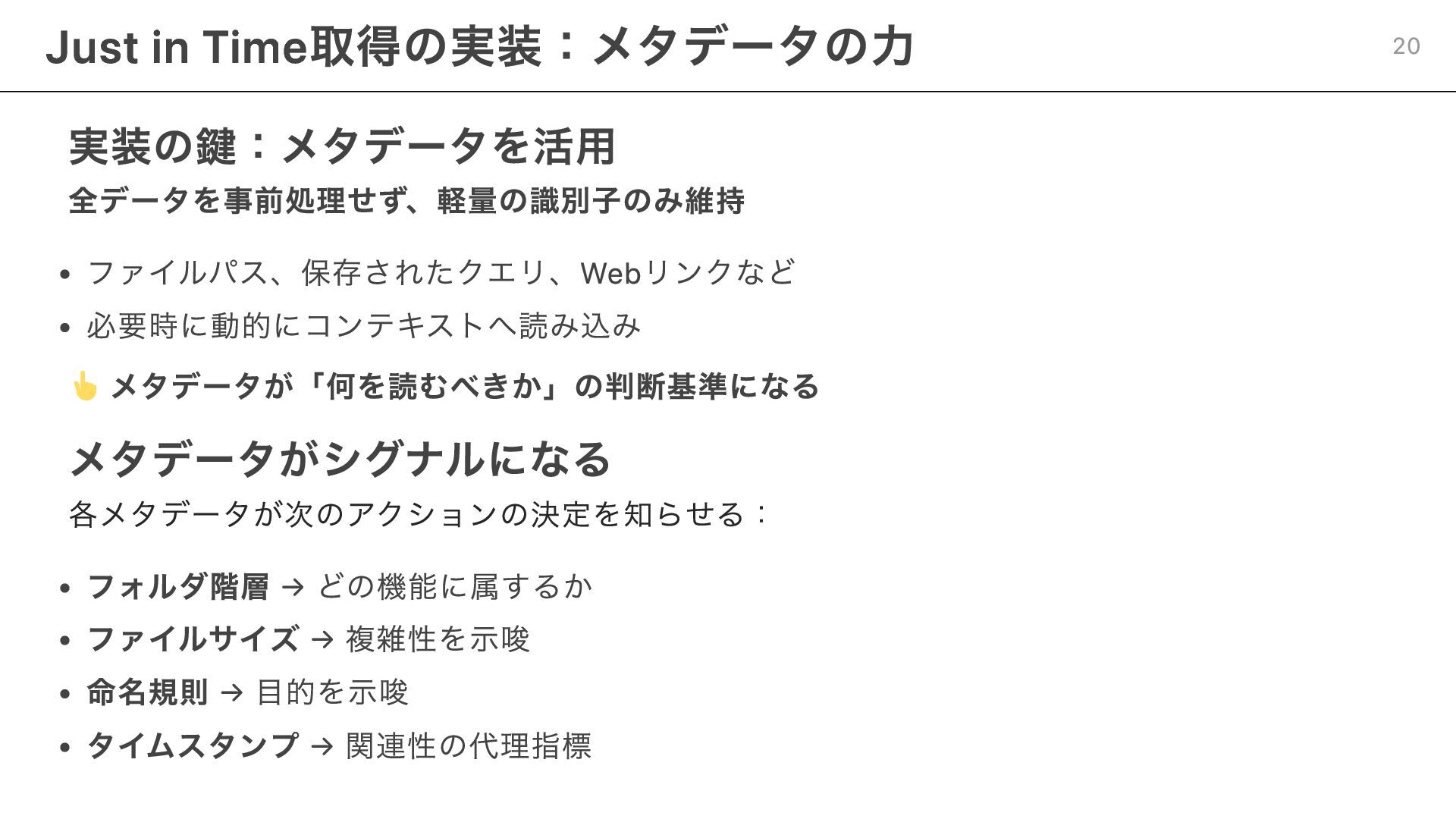 ファイルサイズ → 複雑性を示唆 命名規則 → 目的を示唆 タイムスタンプ → 関連性の代理指標 Just in Time取得の実装:メタデータの力 20