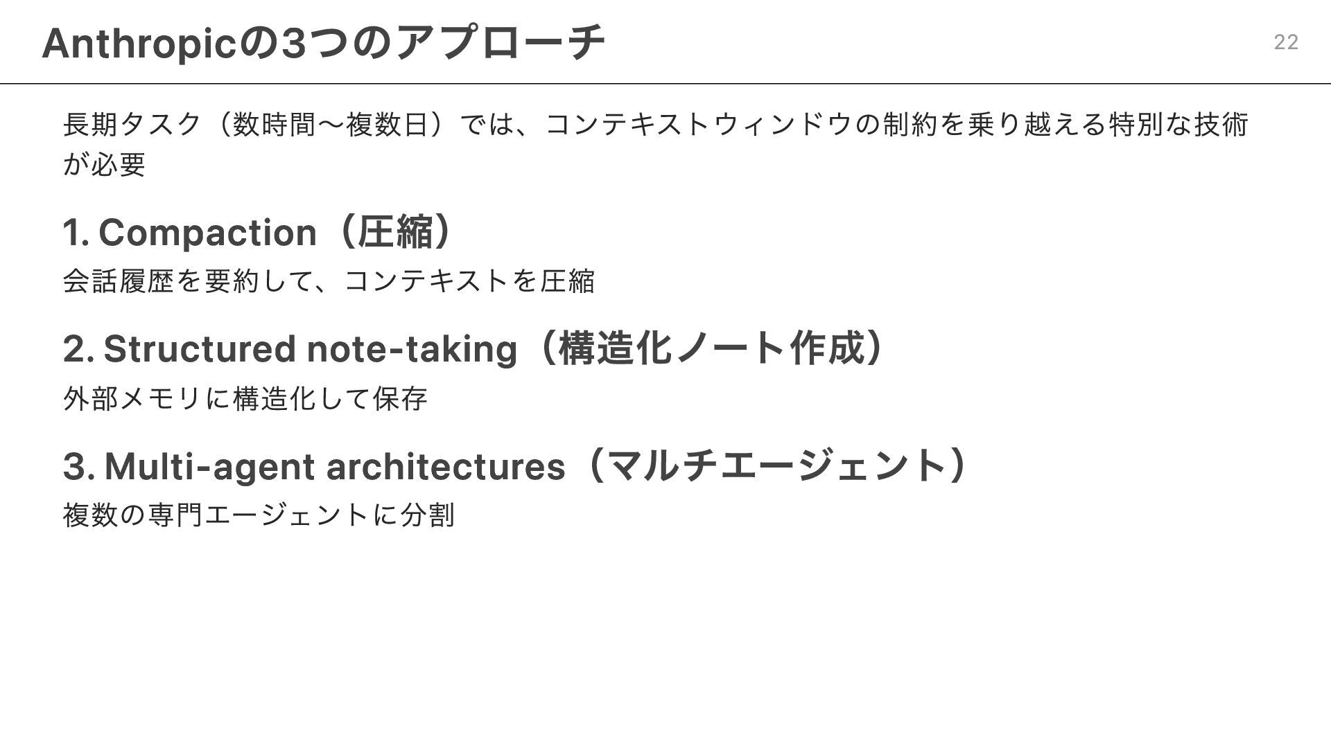 長期タスク(数時間〜複数日)では、コンテキストウィンドウの制約を乗り越える特別な技術 が必要 1. Compaction(圧縮) 会話履歴を要約して、コンテキストを圧縮 2. Structured note-taking(構造化ノート作成) 外部メモリに構造化して保存 3.