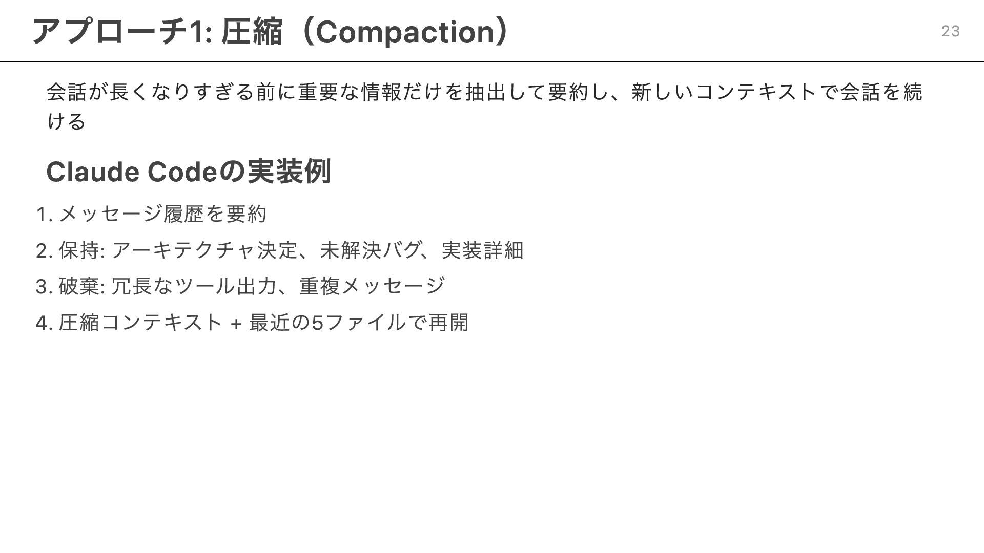 破棄: 冗長なツール出力、重複メッセージ 4. 圧縮コンテキスト + 最近の5ファイルで再開 アプローチ1: 圧縮(Compaction) 23