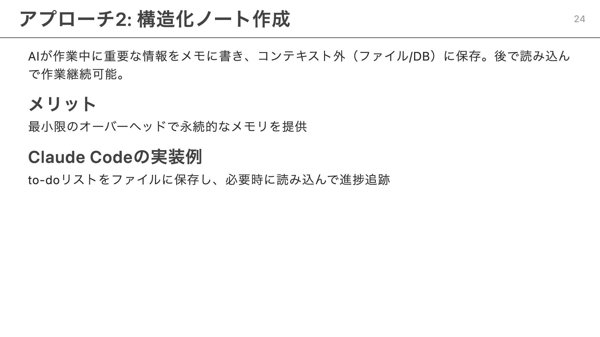 AIが作業中に重要な情報をメモに書き、コンテキスト外(ファイル/DB)に保存。後で読み込ん で作業継続可能。 メリット 最小限のオーバーヘッドで永続的なメモリを提供 Claude Codeの実装例 to-doリストをファイルに保存し、必要時に読み込んで進捗追跡 アプローチ2: 構造化ノート作成 24