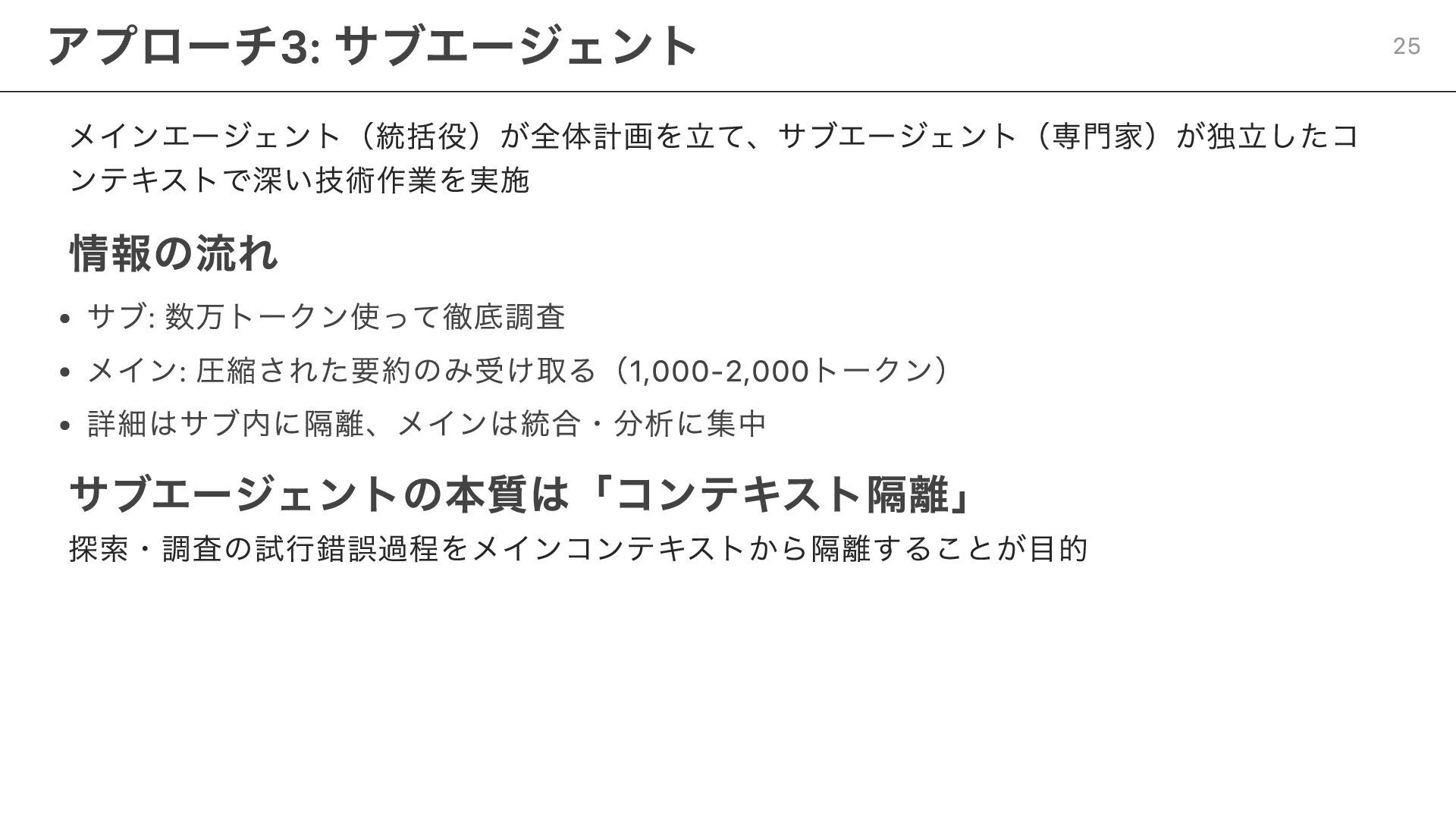 メインエージェント(統括役)が全体計画を立て、サブエージェント(専門家)が独立したコ ンテキストで深い技術作業を実施 情報の流れ サブ: 数万トークン使って徹底調査 メイン: 圧縮された要約のみ受け取る(1,000-2,000トークン) 詳細はサブ内に隔離、メインは統合・分析に集中 サブエージェントの本質は「コンテキスト隔離」 探索・調査の試行錯誤過程をメインコンテキストから隔離することが目的