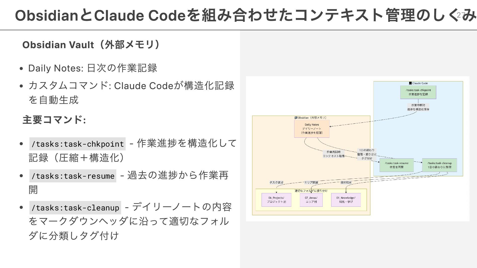 /tasks:task-chkpoint - 作業進捗を構造化して 記録(圧縮+構造化) /tasks:task-resume - 過去の進捗から作業再 開 /tasks:task-cleanup - デイリーノートの内容 をマークダウンヘッダに沿って適切なフォル ダに分類しタグ付け ObsidianとClaude Codeを組み合わせたコンテキスト管理のしくみ 27