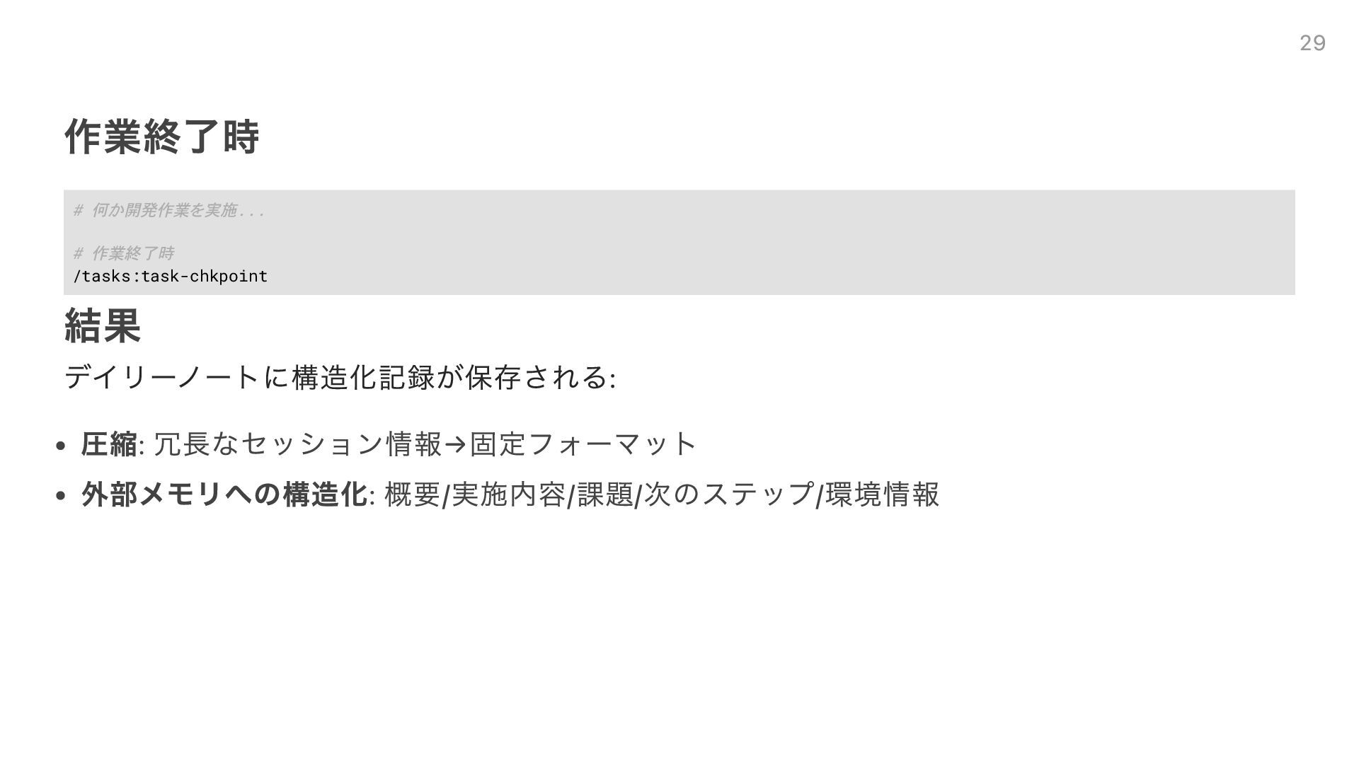 作業終了時 # 何か開発作業を実施... # 作業終了時 /tasks:task-chkpoint 結果 デイリーノートに構造化記録が保存される: 圧縮: 冗長なセッション情報→固定フォーマット