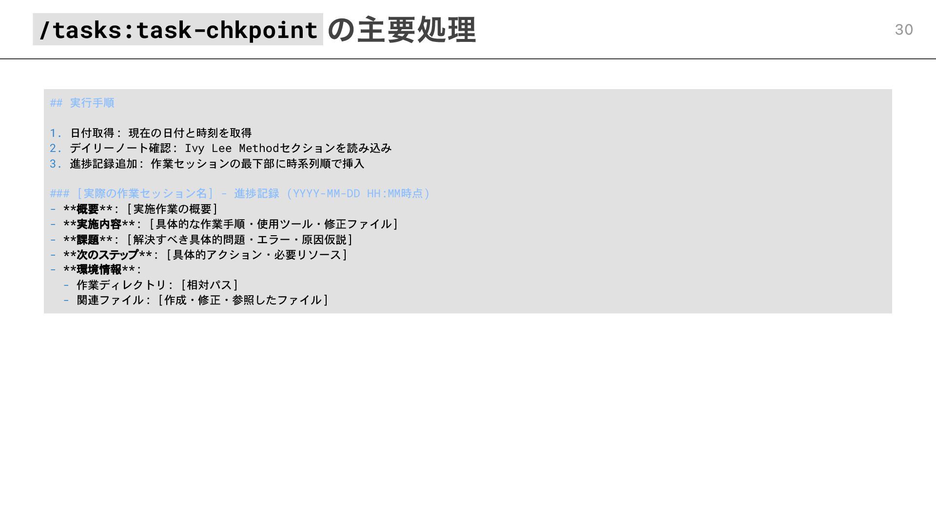 3. 進捗記録追加: 作業セッションの最下部に時系列順で挿入 ### [実際の作業セッション名] - 進捗記録 (YYYY-MM-DD HH:MM時点) - **概要**: [実施作業の概要] - **実施内容**: [具体的な作業手順・使用ツール・修正ファイル] - **課題**: [解決すべき具体的問題・エラー・原因仮説] - **次のステップ**: [具体的アクション・必要リソース] - **環境情報**: - 作業ディレクトリ: [相対パス] - 関連ファイル: [作成・修正・参照したファイル] /tasks:task-chkpoint の主要処理 30
