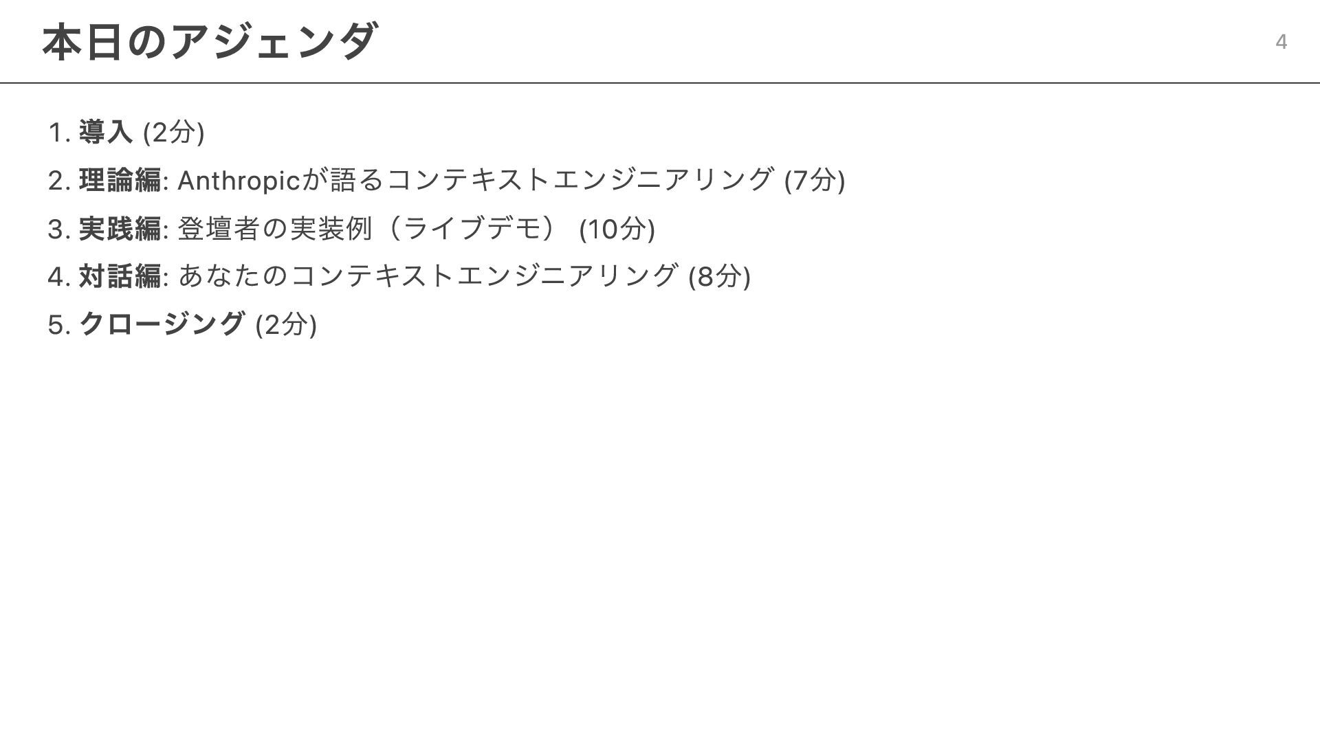 1. 導入 (2分) 2. 理論編: Anthropicが語るコンテキストエンジニアリング (7分) 3. 実践編: 登壇者の実装例(ライブデモ)