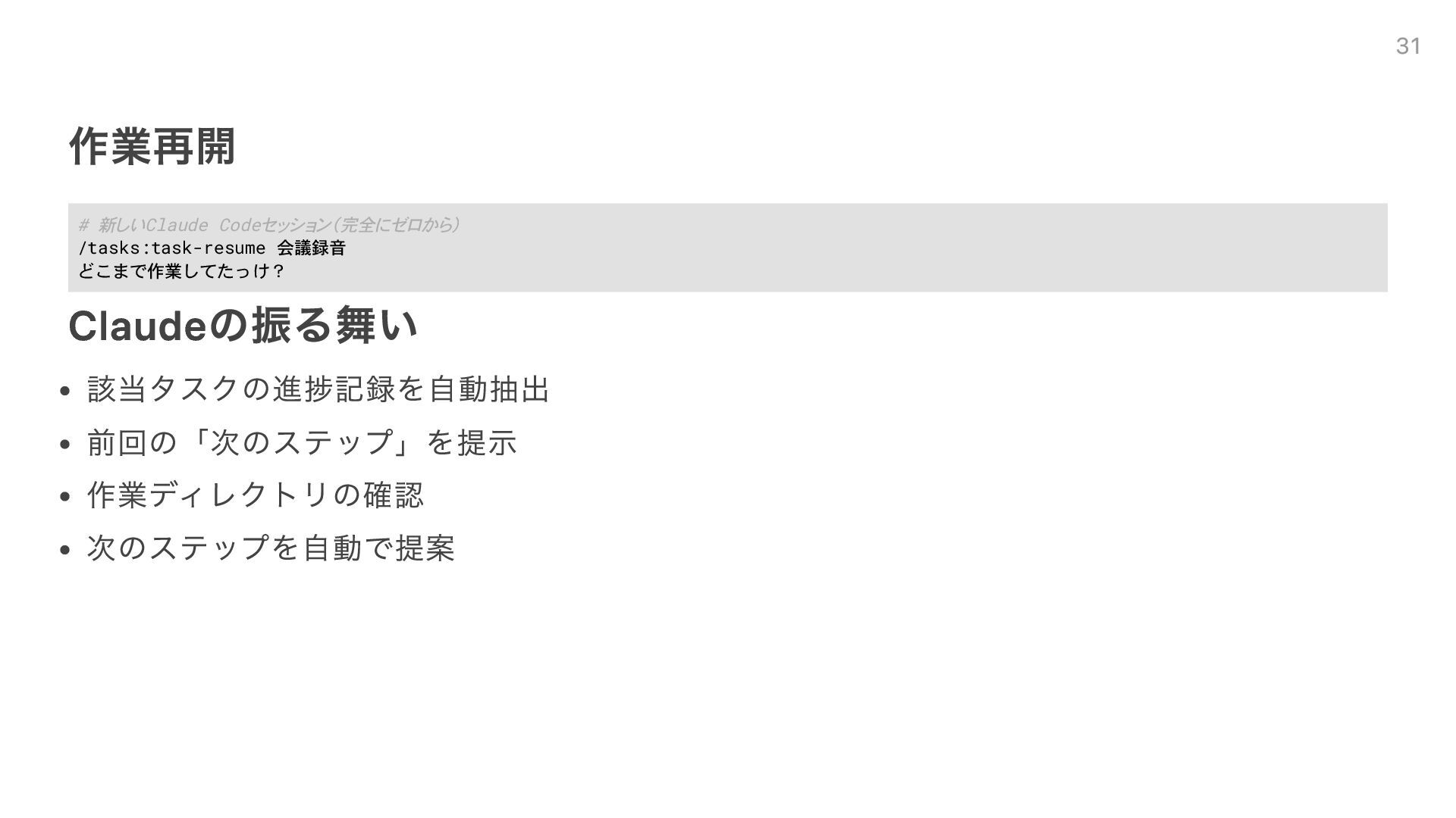 作業再開 # 新しいClaude Codeセッション(完全にゼロから) /tasks:task-resume 会議録音 どこまで作業してたっけ? Claudeの振る舞い 該当タスクの進捗記録を自動抽出 前回の「次のステップ」を提示