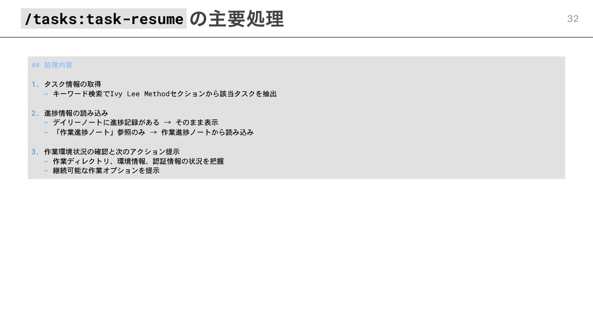 - デイリーノートに進捗記録がある → そのまま表示 - 「作業進捗ノート」参照のみ → 作業進捗ノートから読み込み 3. 作業環境状況の確認と次のアクション提示 - 作業ディレクトリ、環境情報、認証情報の状況を把握 - 継続可能な作業オプションを提示 /tasks:task-resume の主要処理 32