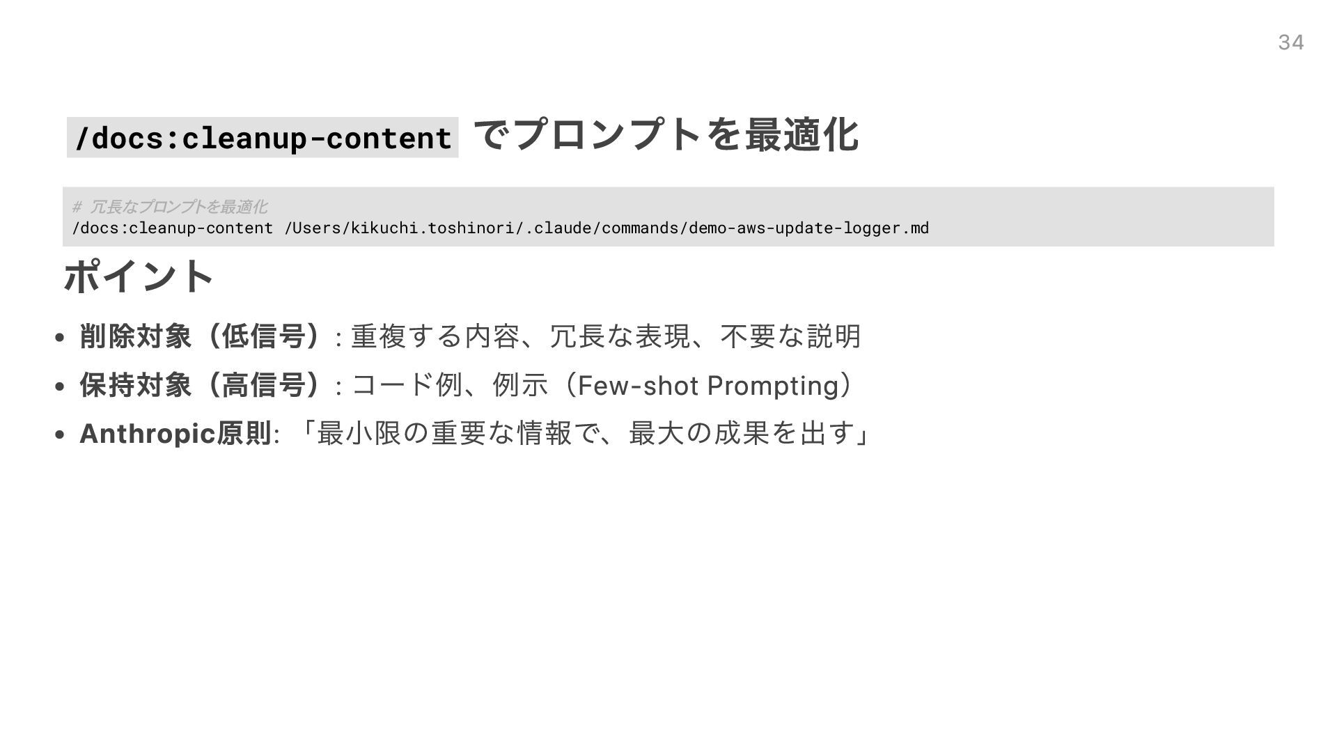 /docs:cleanup-content でプロンプトを最適化 # 冗長なプロンプトを最適化 /docs:cleanup-content /Users/kikuchi.toshinori/.claude/commands/demo-aws-update-logger.md ポイント 削除対象(低信号): 重複する内容、冗長な表現、不要な説明 保持対象(高信号):