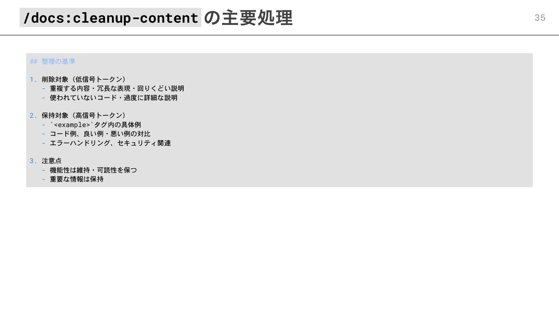 - `<example>`タグ内の具体例 - コード例、良い例・悪い例の対比 - エラーハンドリング、セキュリティ関連 3. 注意点 - 機能性は維持・可読性を保つ - 重要な情報は保持 /docs:cleanup-content の主要処理 35