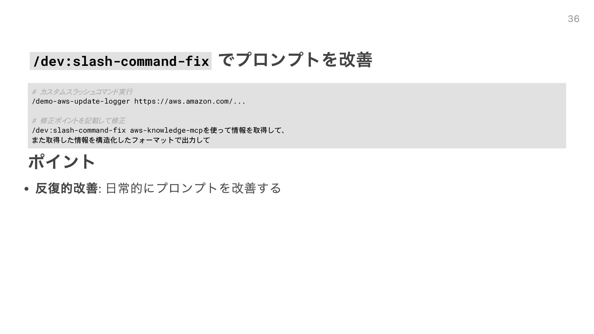 /dev:slash-command-fix でプロンプトを改善 # カスタムスラッシュコマンド実行 /demo-aws-update-logger https://aws.amazon.com/... # 修正ポイントを記載して修正 /dev:slash-command-fix aws-knowledge-mcpを使って情報を取得して、