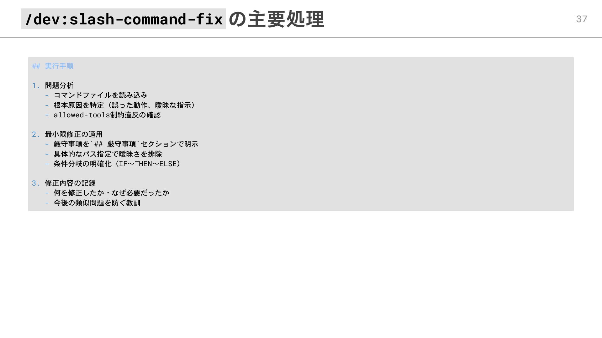 2. 最小限修正の適用 - 厳守事項を`## 厳守事項`セクションで明示 - 具体的なパス指定で曖昧さを排除 - 条件分岐の明確化(IF〜THEN〜ELSE) 3. 修正内容の記録 - 何を修正したか・なぜ必要だったか - 今後の類似問題を防ぐ教訓 /dev:slash-command-fix の主要処理 37