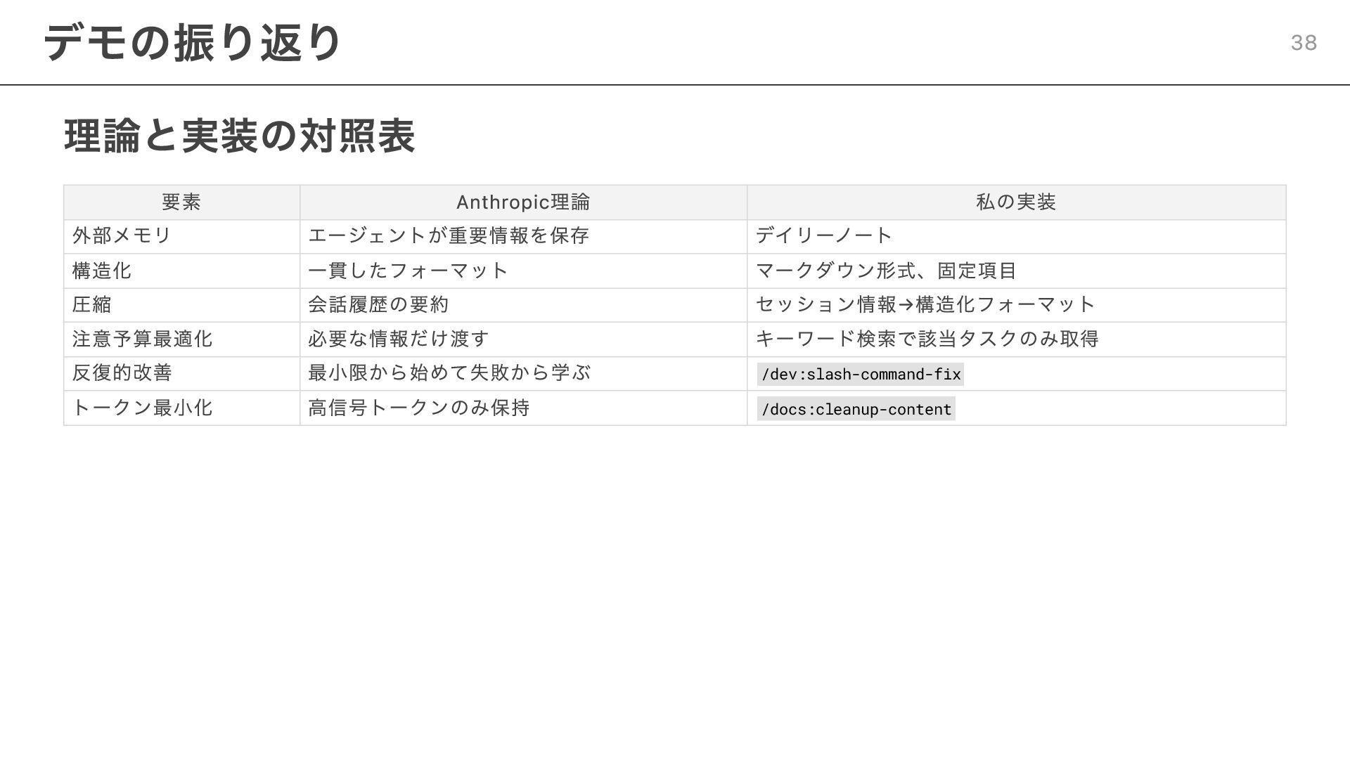 圧縮 会話履歴の要約 セッション情報→構造化フォーマット 注意予算最適化 必要な情報だけ渡す キーワード検索で該当タスクのみ取得 反復的改善 最小限から始めて失敗から学ぶ /dev:slash-command-fix トークン最小化 高信号トークンのみ保持 /docs:cleanup-content デモの振り返り 38