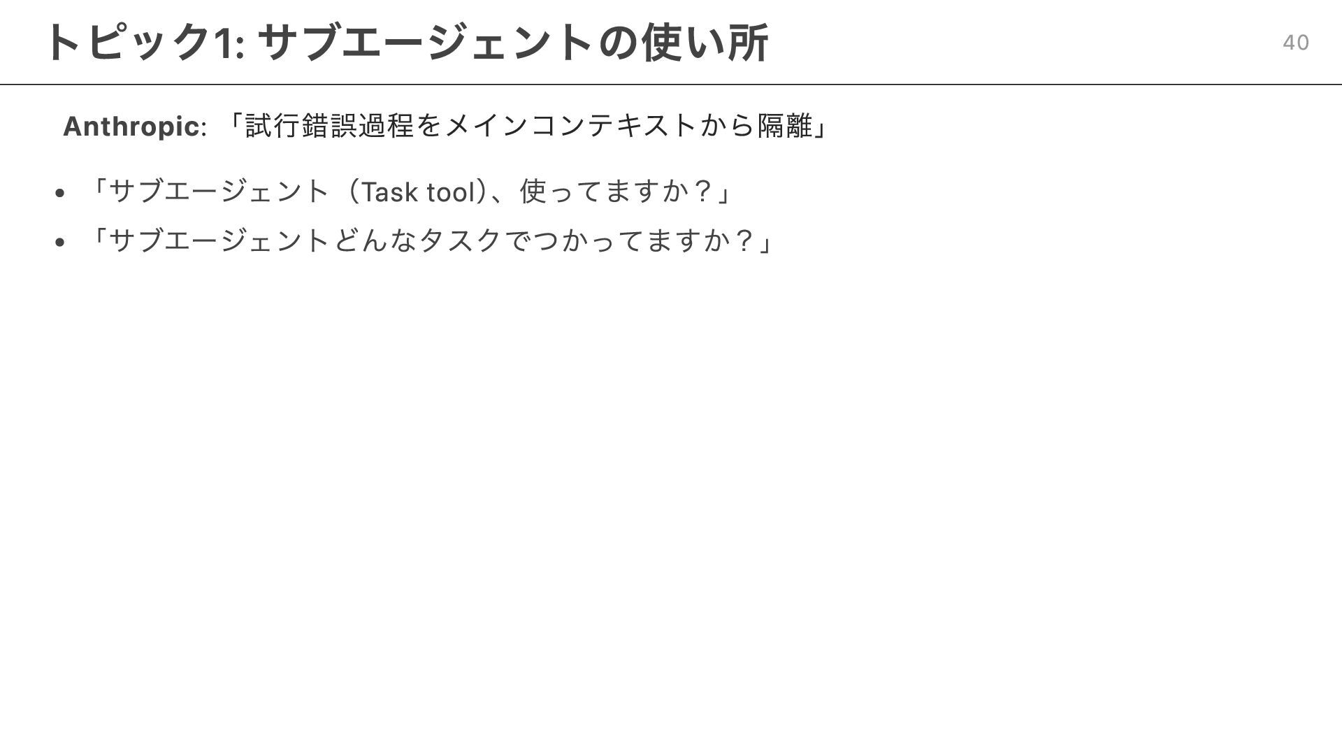 Anthropic: 「試行錯誤過程をメインコンテキストから隔離」 「サブエージェント(Task tool) 、使ってますか?」 「サブエージェントどんなタスクでつかってますか?」 トピック1: サブエージェントの使い所 40