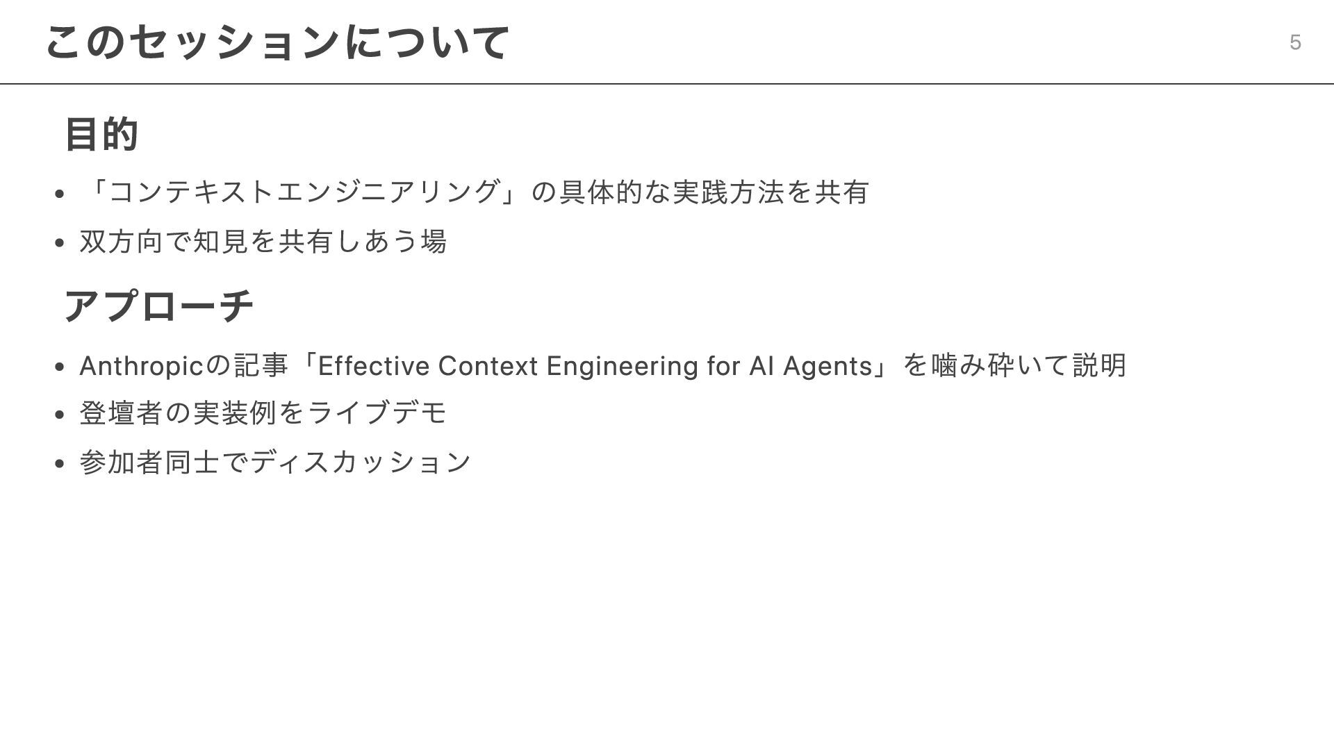 目的 「コンテキストエンジニアリング」の具体的な実践方法を共有 双方向で知見を共有しあう場 アプローチ Anthropicの記事「Effective Context Engineering for AI Agents」を噛み砕いて説明