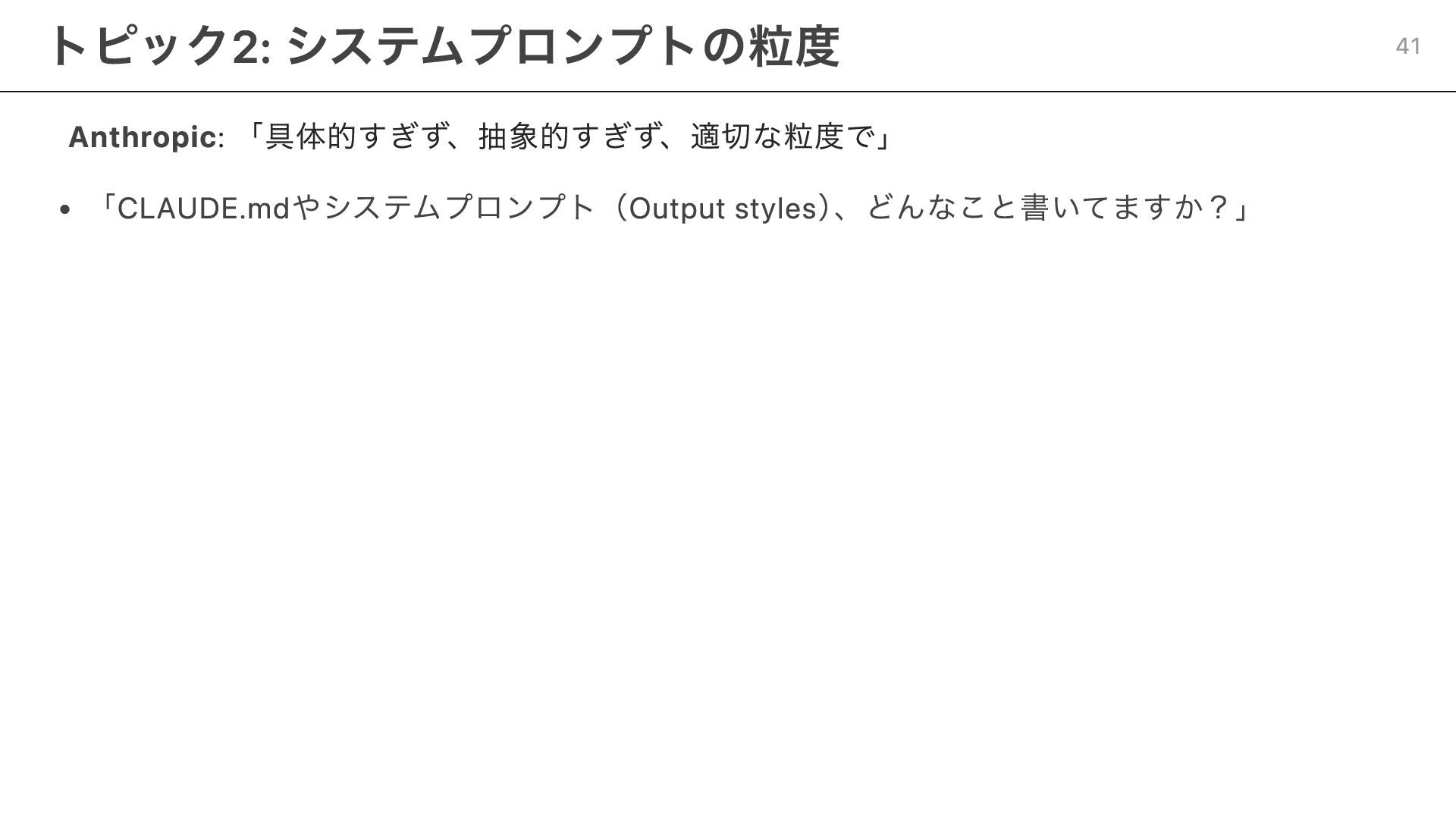Anthropic: 「具体的すぎず、抽象的すぎず、適切な粒度で」 「CLAUDE.mdやシステムプロンプト(Output styles) 、どんなこと書いてますか?」 トピック2: システムプロンプトの粒度 41