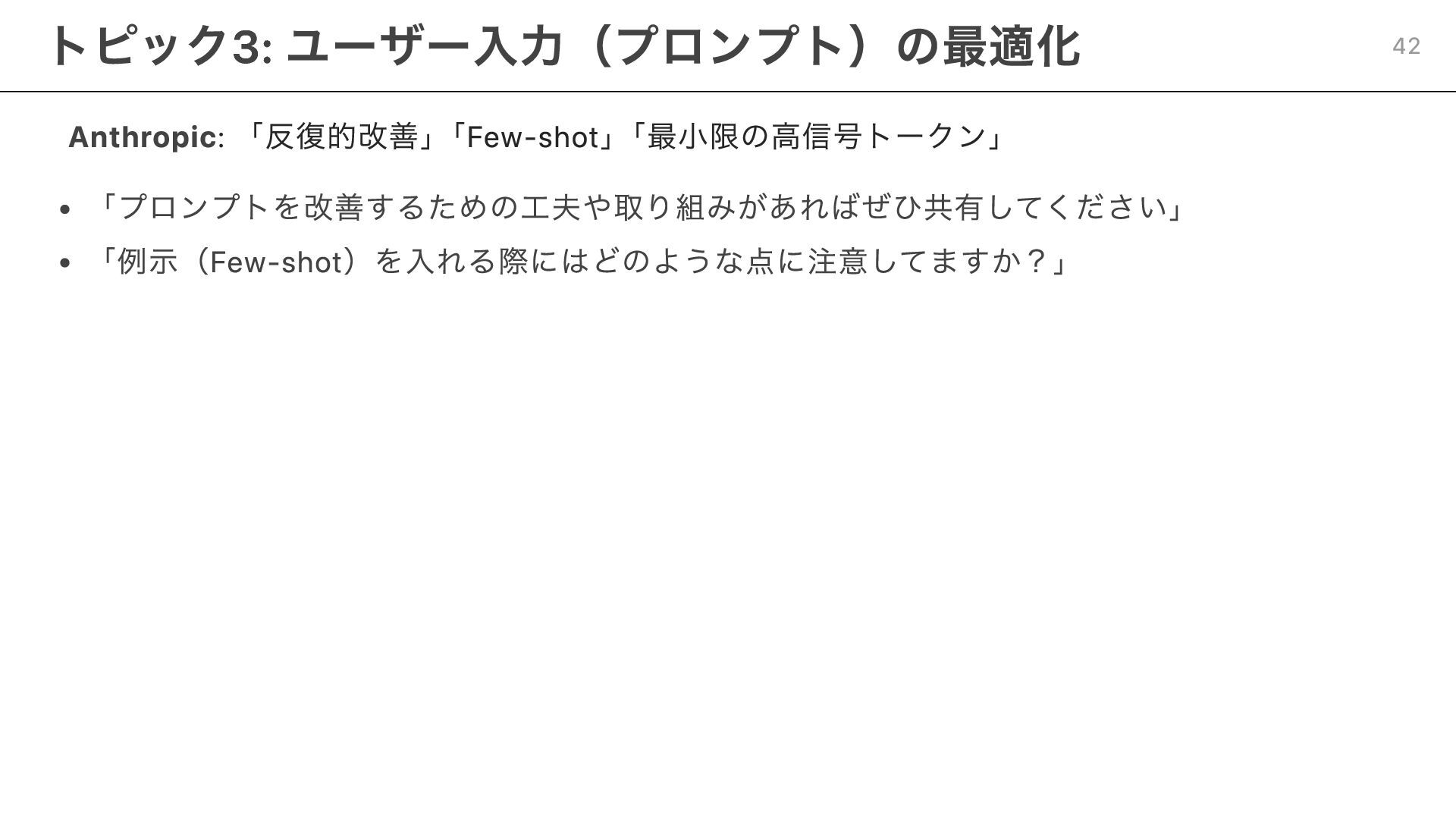 Anthropic: 「反復的改善」 「Few-shot」 「最小限の高信号トークン」 「プロンプトを改善するための工夫や取り組みがあればぜひ共有してください」 「例示(Few-shot)を入れる際にはどのような点に注意してますか?」 トピック3: ユーザー入力(プロンプト)の最適化 42