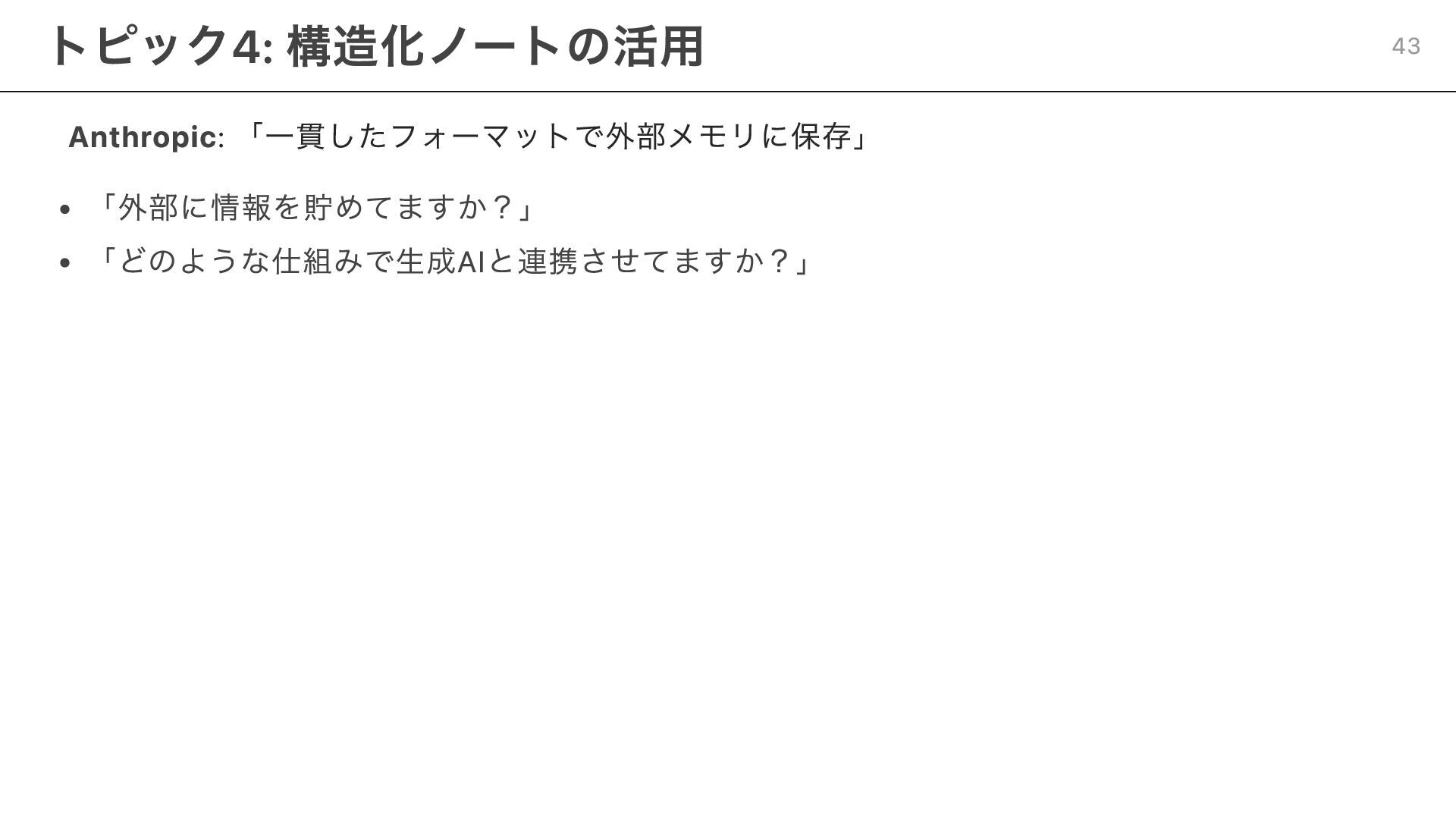 Anthropic: 「一貫したフォーマットで外部メモリに保存」 「外部に情報を貯めてますか?」 「どのような仕組みで生成AIと連携させてますか?」 トピック4: 構造化ノートの活用 43
