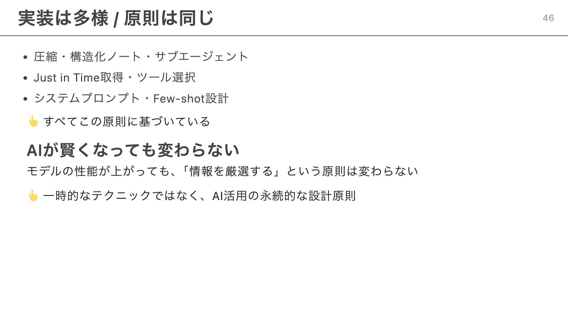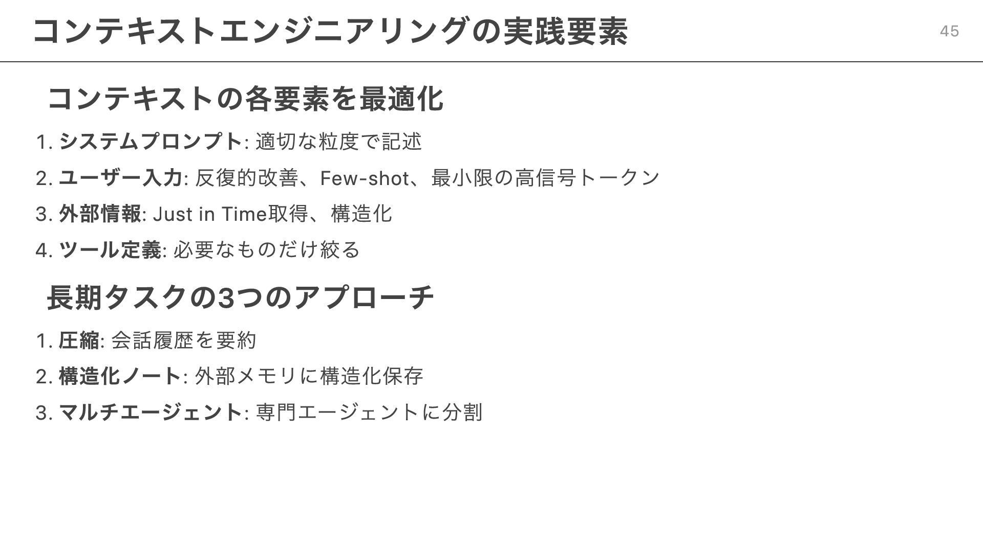 in Time取得、構造化 4. ツール定義: 必要なものだけ絞る 長期タスクの3つのアプローチ 1. 圧縮: 会話履歴を要約 2. 構造化ノート: 外部メモリに構造化保存 3. マルチエージェント: 専門エージェントに分割 コンテキストエンジニアリングの実践要素 45