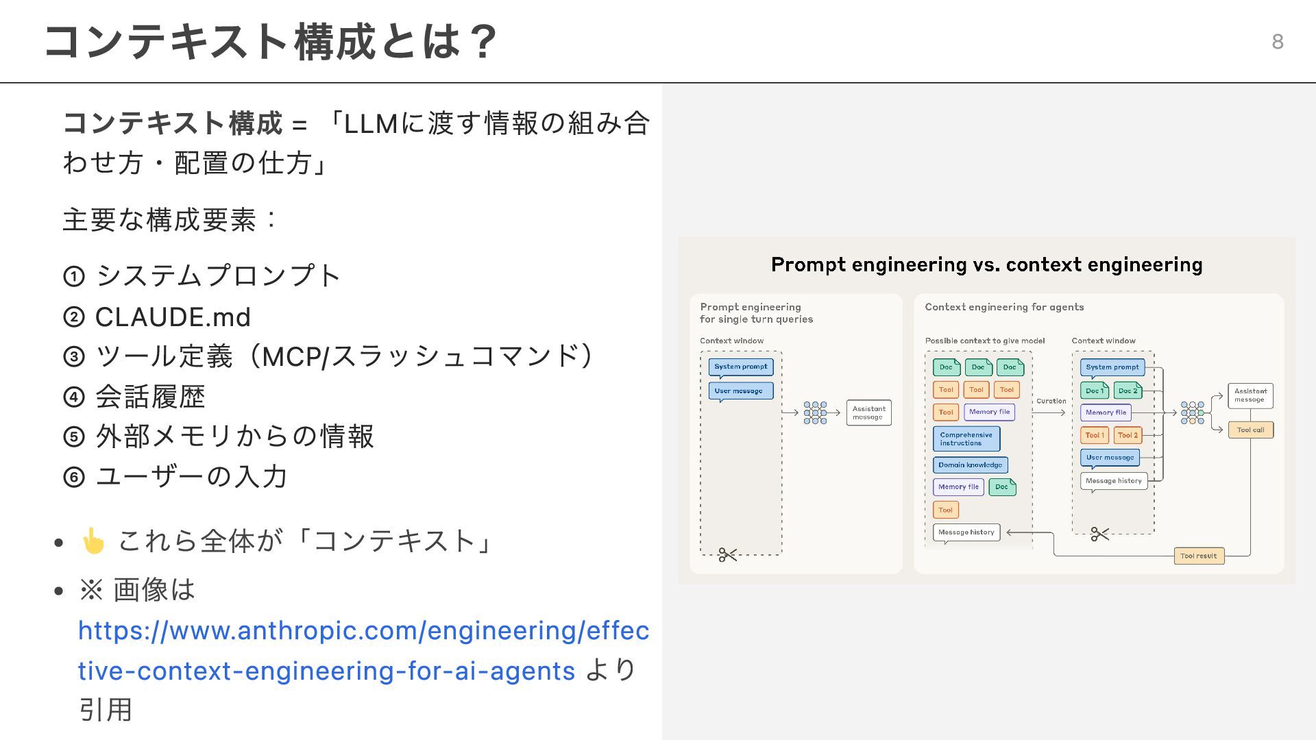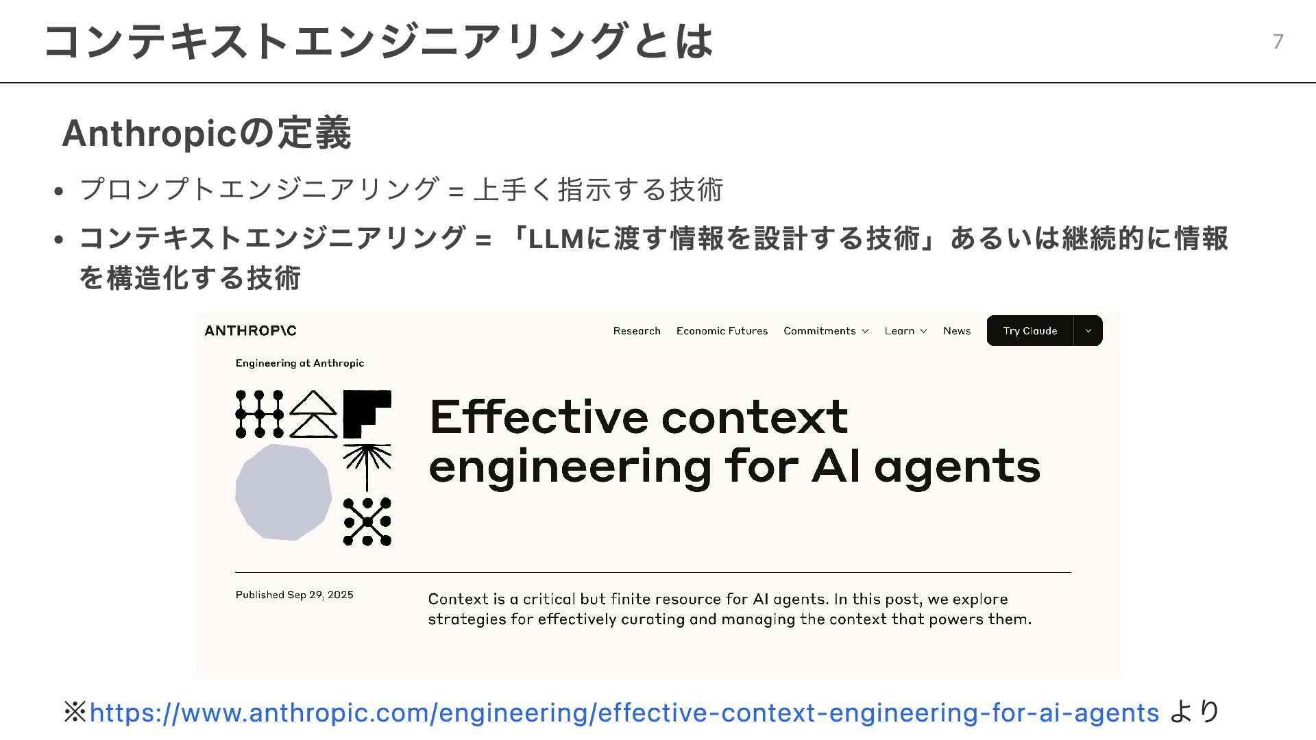 Anthropicの定義 プロンプトエンジニアリング = 上手く指示する技術 コンテキストエンジニアリング = 「LLMに渡す情報を設計する技術」あるいは継続的に情報 を構造化する技術 ※https://www.anthropic.com/engineering/effective-context-engineering-for-ai-agents より