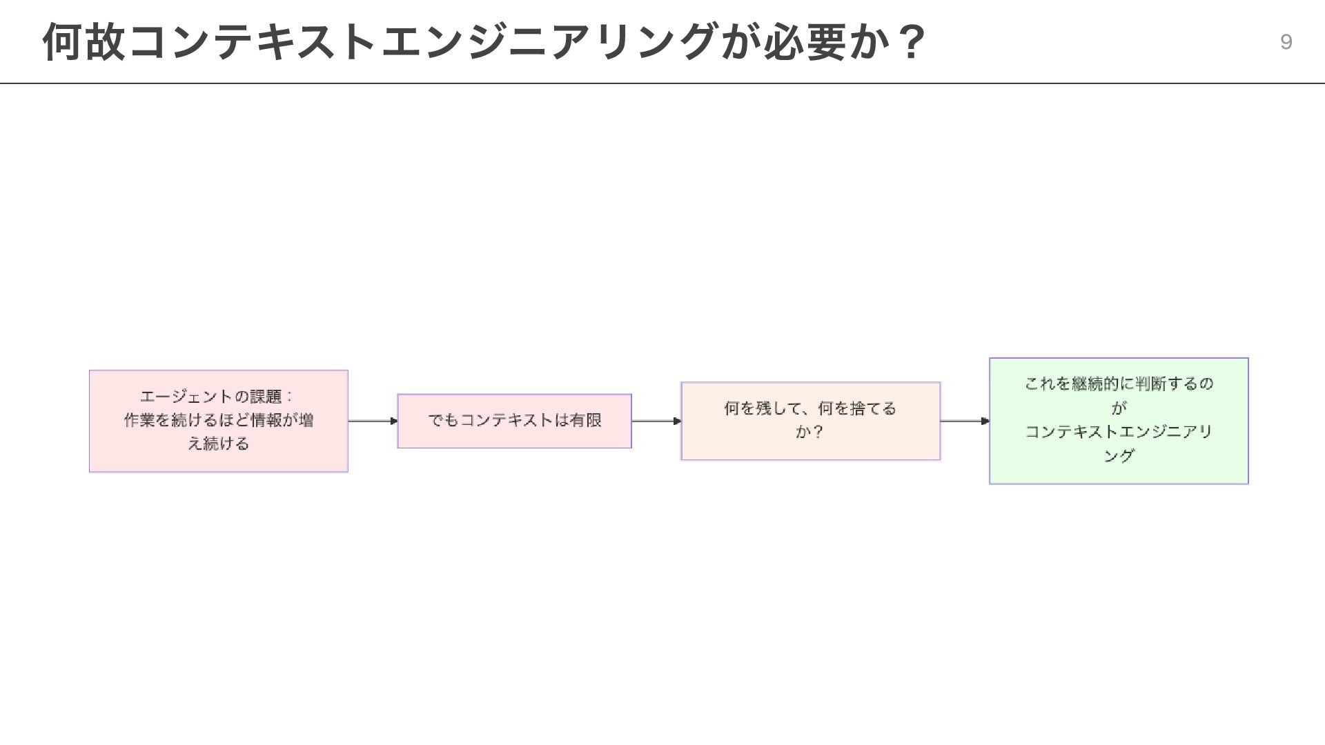 ツール定義(MCP/スラッシュコマンド) ④ 会話履歴 ⑤ 外部メモリからの情報 ⑥ ユーザーの入力 これら全体が「コンテキスト」 ※ 画像は https://www.anthropic.com/engineering/effec tive-context-engineering-for-ai-agents より 引用 コンテキスト構成とは? 8