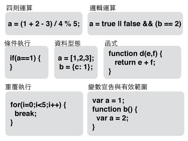 5; if(a==1) { } for(i=0;i<5;i++) { break; } a = [1,2,3]; b = {c: 1}; function d(e,f) { return e + f; } a = true || false && (b == 2) var a = 1; function b() { var a = 2; } 四則運算 邏輯運算 條件執⾏行 資料型態 函式 重覆執⾏行 變數宣告與有效範圍