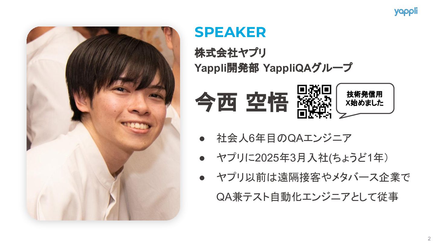 1. SPEAKER 株式会社ヤプリ Yappli開発部 YappliQAグループ 今西 空悟 • 社会人6年目のQAエンジニア • ヤプリに2025年3月入社(ちょうど1年)