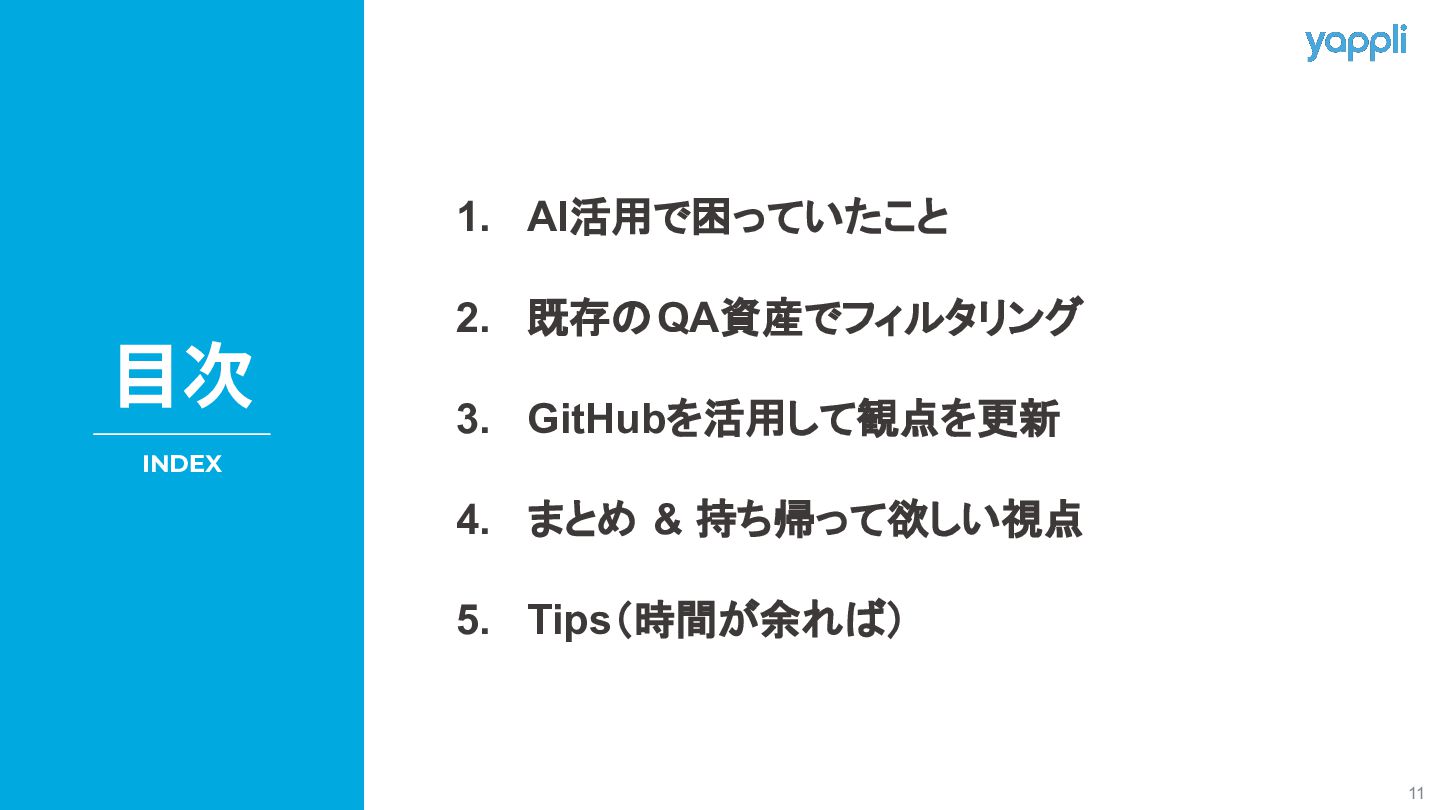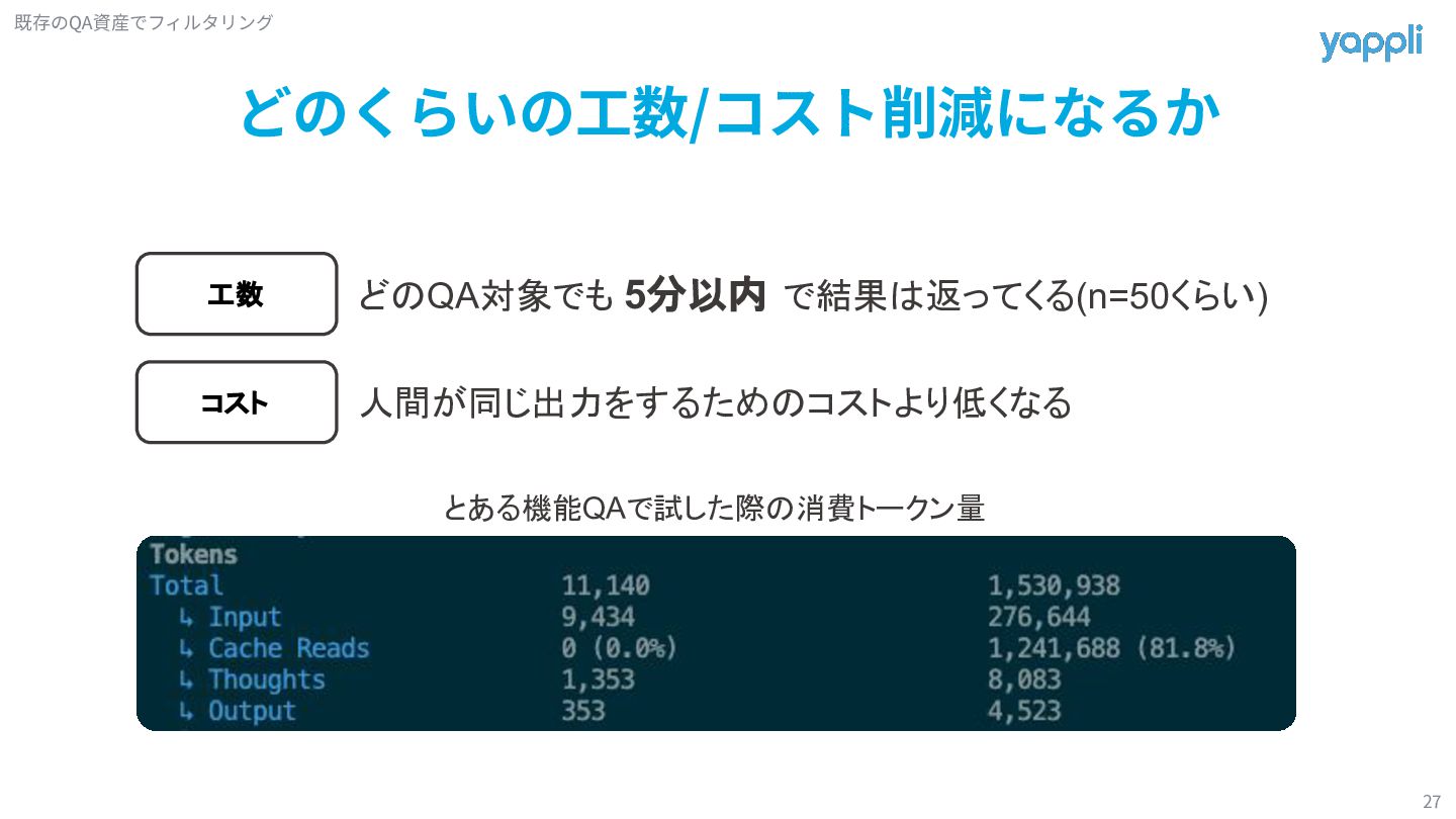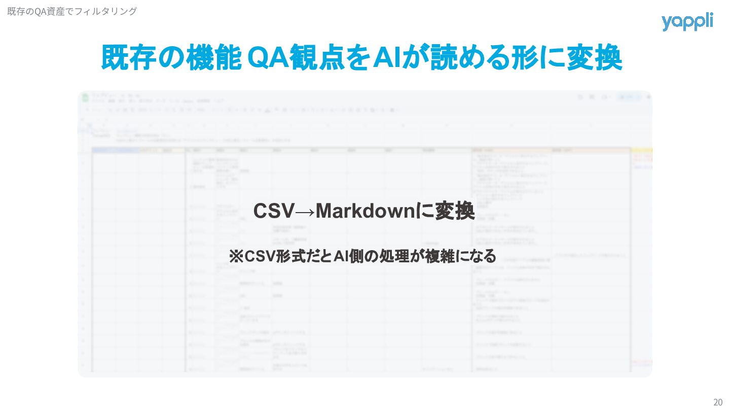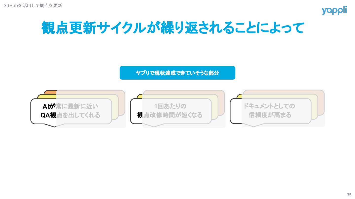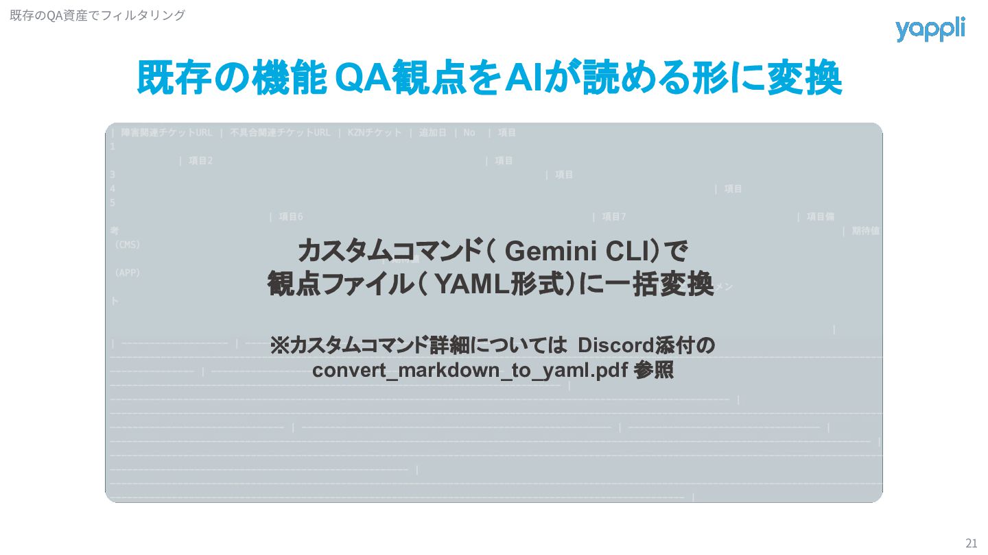 定期ミーティングで修正 A機能 B機能 C機能 D機能 定期ミーティングでは機能単位で 観点の追加や修正を行う チケット毎では検証後に 該当機能観点の追加や修正を行う AI観点作成で捻出した時間を 本来できていなかった観点メンテナンスに割り振っていく Tips(時間が余れば話します)