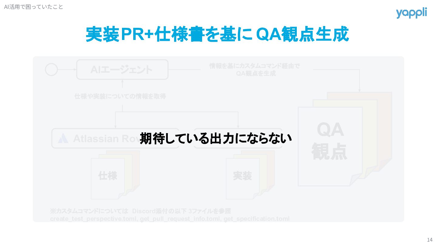 QA 観点 実装 仕様や実装についての情報を取得 情報を基にカスタムコマンド経由で QA観点を生成 ※カスタムコマンドについては Discord添付の以下 3ファイルを参照 create_test_perspective.toml, get_pull_request_info.toml, get_specification.toml 期待している出力にならない AI活⽤で困っていたこと
