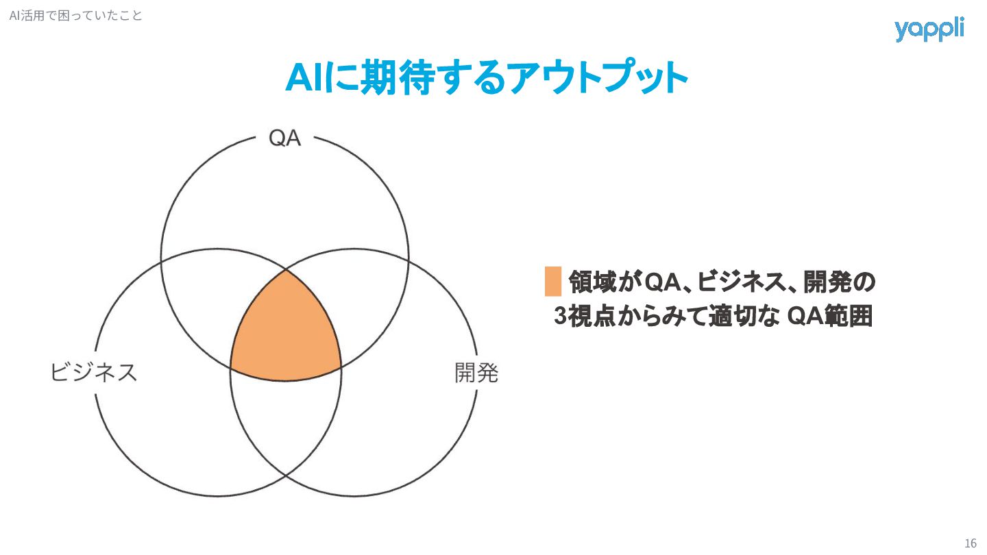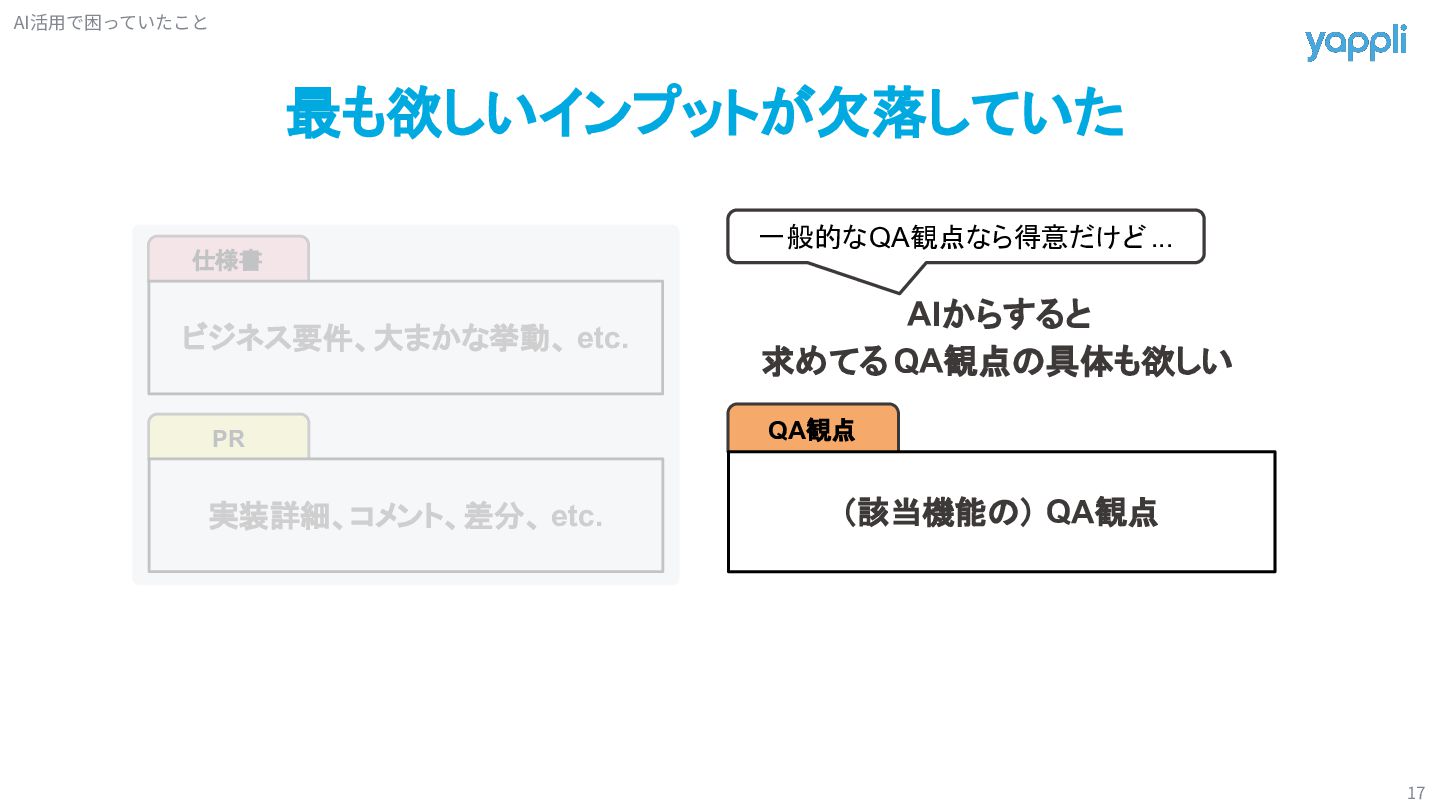QA観点 AIからすると 求めてるQA観点の具体も欲しい 一般的なQA観点なら得意だけど ... AI活⽤で困っていたこと