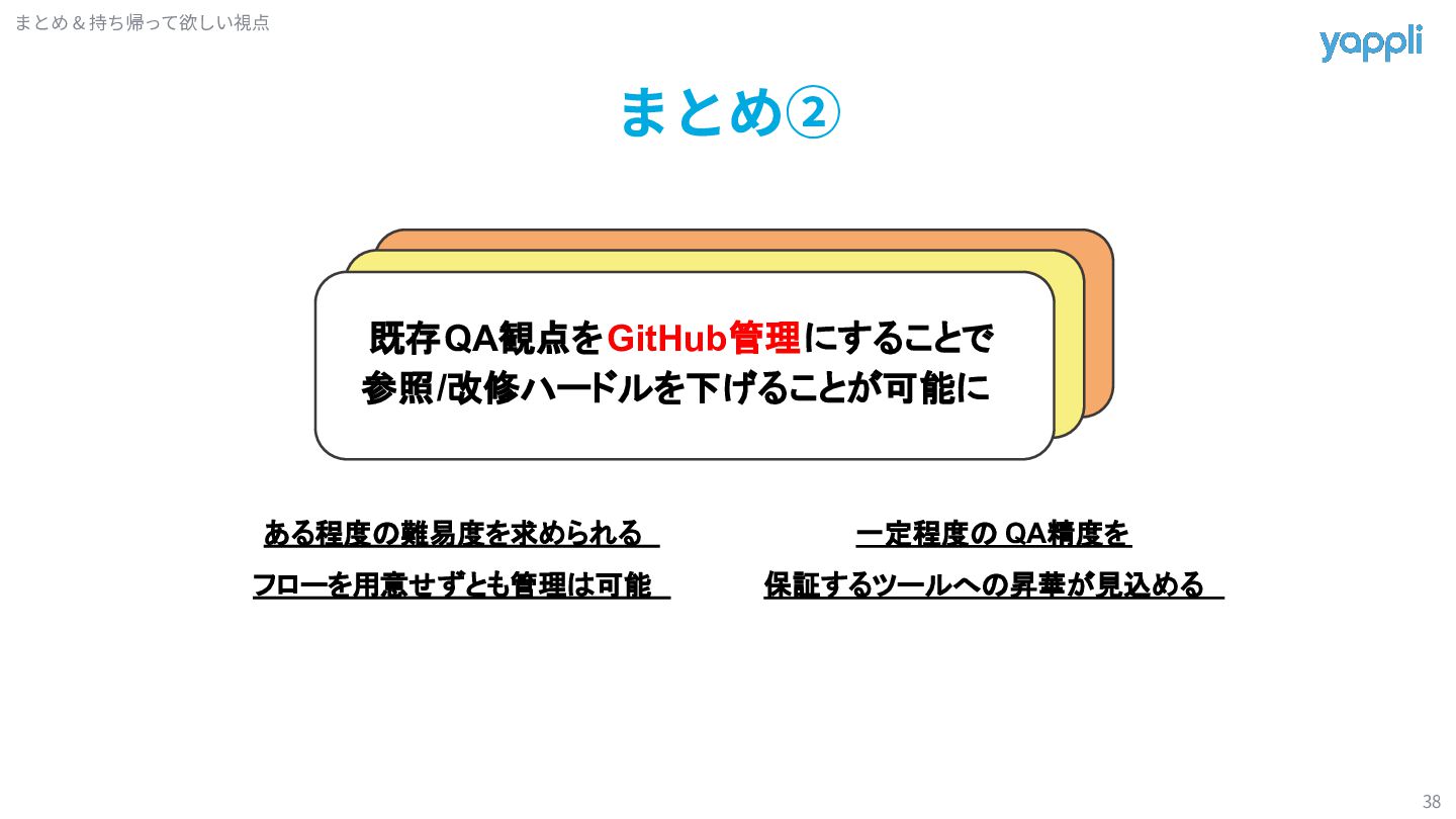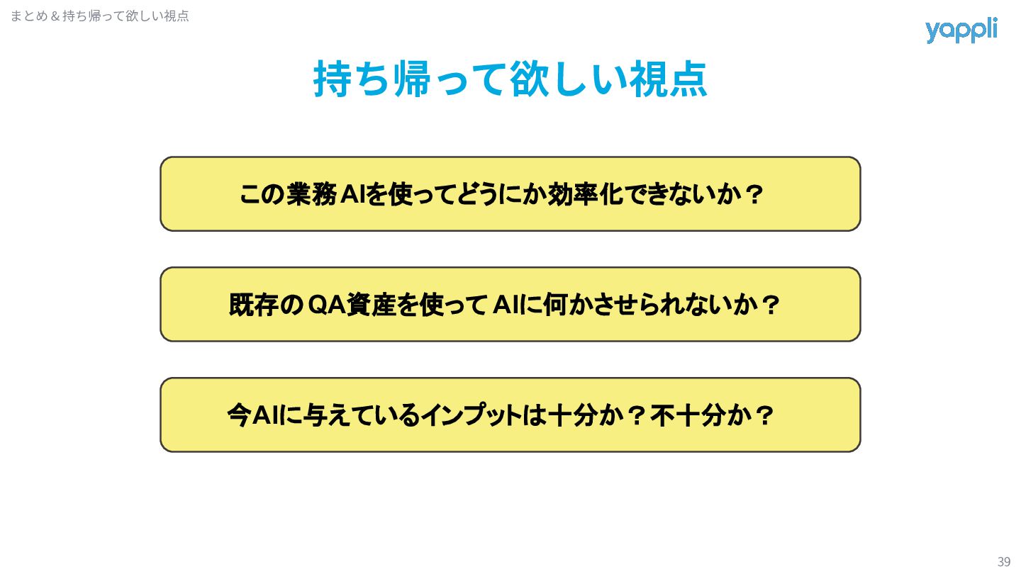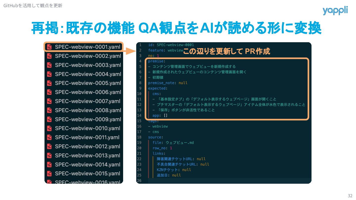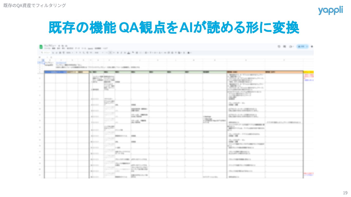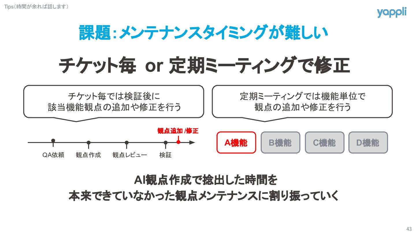 B機能 C機能 D機能 定期ミーティングでは機能単位で 観点の追加や修正を行う チケット毎では検証後に 該当機能観点の追加や修正を行う AI観点作成で捻出した時間を 本来できていなかった観点メンテナンスに割り振っていく Tips(時間が余れば話します) 観点追加 /修正