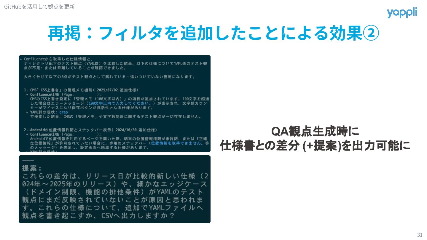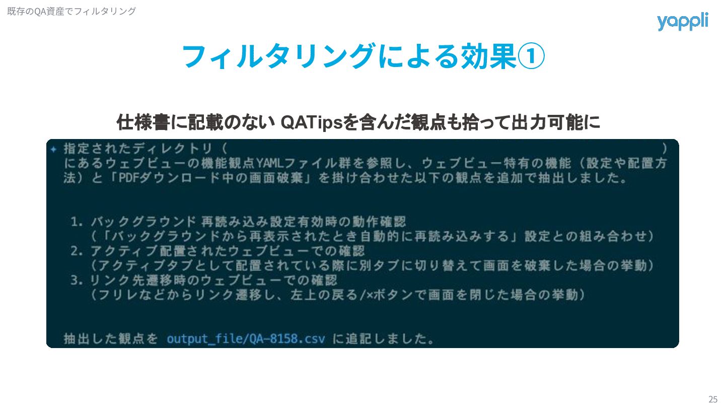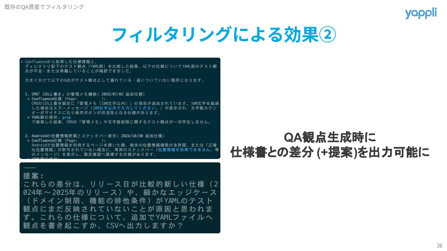 観点 実装 仕様や実装についての情報を取得 情報を基にカスタムコマンド経由で QA観点を生成 既存のQA資産でフィルタリング