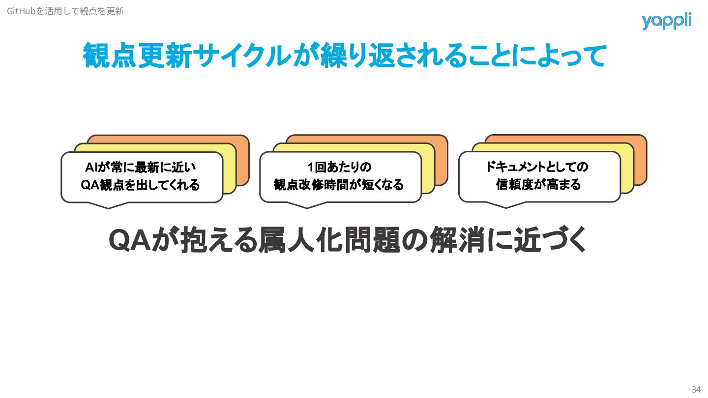10. 課題:メンテナンスタイミングが難しい 33 QA依頼 観点作成 観点レビュー 検証 チケット毎 or 定期ミーティングで修正 A機能
