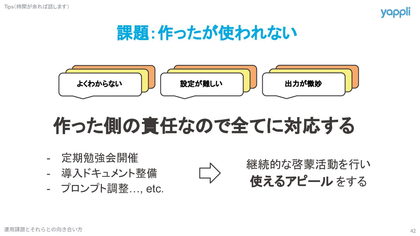 導入ドキュメント整備 - プロンプト調整…, etc. 継続的な啓蒙活動を行い 使えるアピール をする Tips(時間が余れば話します)