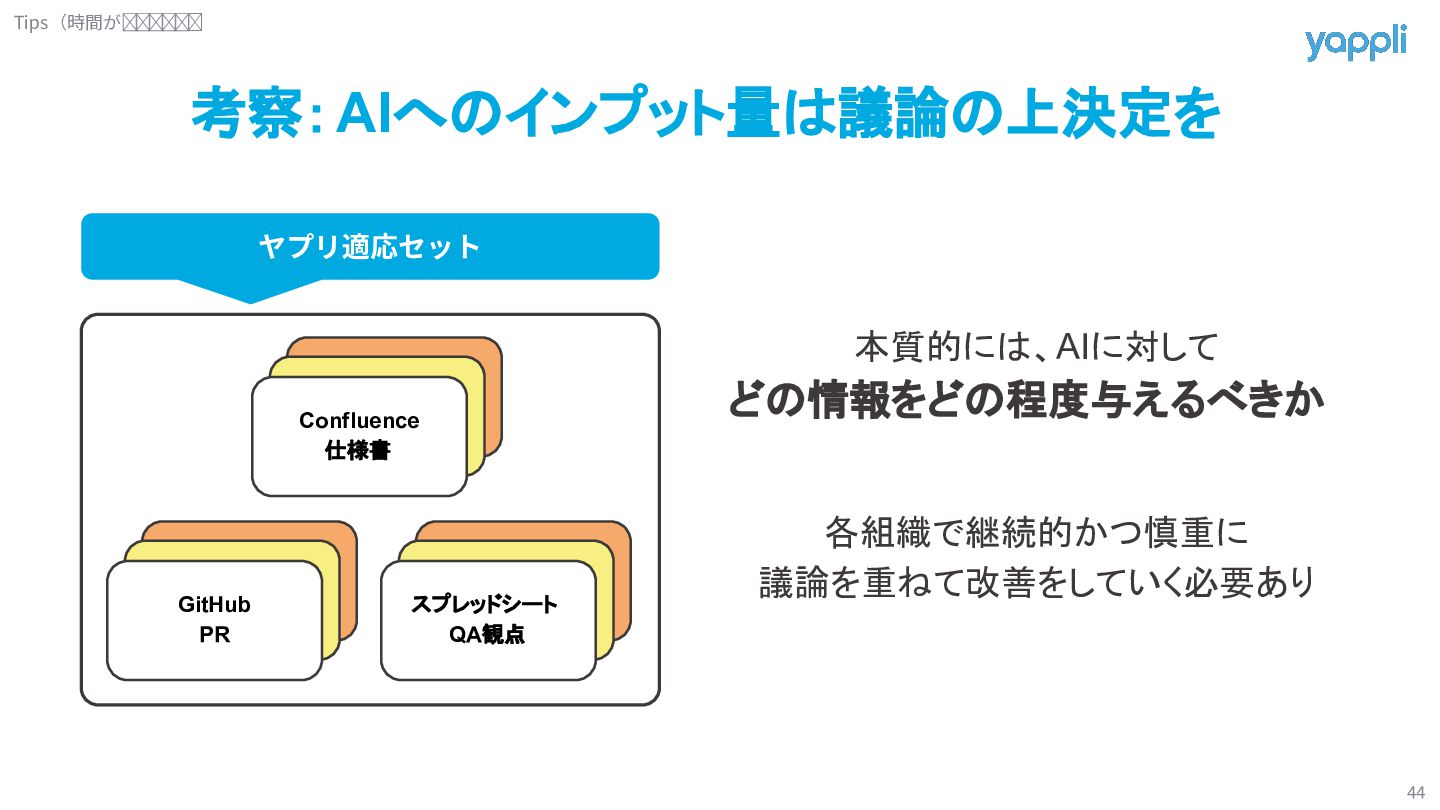 13. 考察:AIへのインプット量は議論の上決定を 44 Confluence 仕様書 GitHub PR スプレッドシート QA観点 本質的には、AIに対して どの情報をどの程度与えるべきか