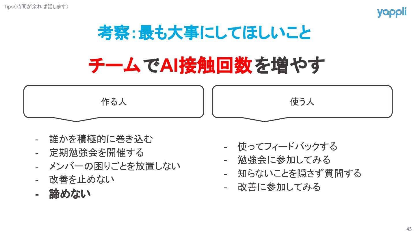 14. 考察:最も大事にしてほしいこと 45 チームでAI接触回数を増やす 使う人 作る人 - 誰かを積極的に巻き込む - 定期勉強会を開催する -