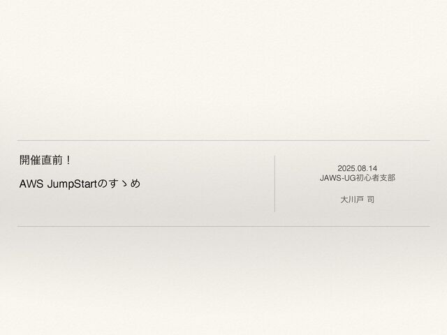 தతͳΦϯϥΠϯϫʔΫγϣοϓΛ௨ͯ͠ɺօ༷ͷ AWS ʹର͢ΔཧղΛҰؾʹҾ্͖͛Δ͜ͱΛ తͱ͍ͯ͠·͢ɻ w AWS ʹ͍ͭͯΛฉ͍ͨ͜ͱ͋Δ͕ͬͨ͜ͱͳ͍ w EC2 ͷ୯ମαʔϏε৮ͬͨ͜ͱ͋Δ͕ɺγεςϜશମͷઃܭܦݧͳ͍ w ΫϥυωΠςΟϒͳΞϓϦέʔγϣϯΛઃܭ͢Δ্Ͱॏཁͳ؍ΛΓ͍ͨ ͱ͍ͬͨํʑʹظؒͰҰؾʹϨϕϧΞοϓͰ͖Δ༰ͱͳ͍ͬͯΔͷͰɺAWS Λֶͼ͡ΊΔͷ ʹ͍ͬͯ͜ͷϓϩάϥϜͱͳ͍ͬͯ·͢ɻ https://aws.amazon.com/jp/blogs/news/aws-jumpstart-2025/