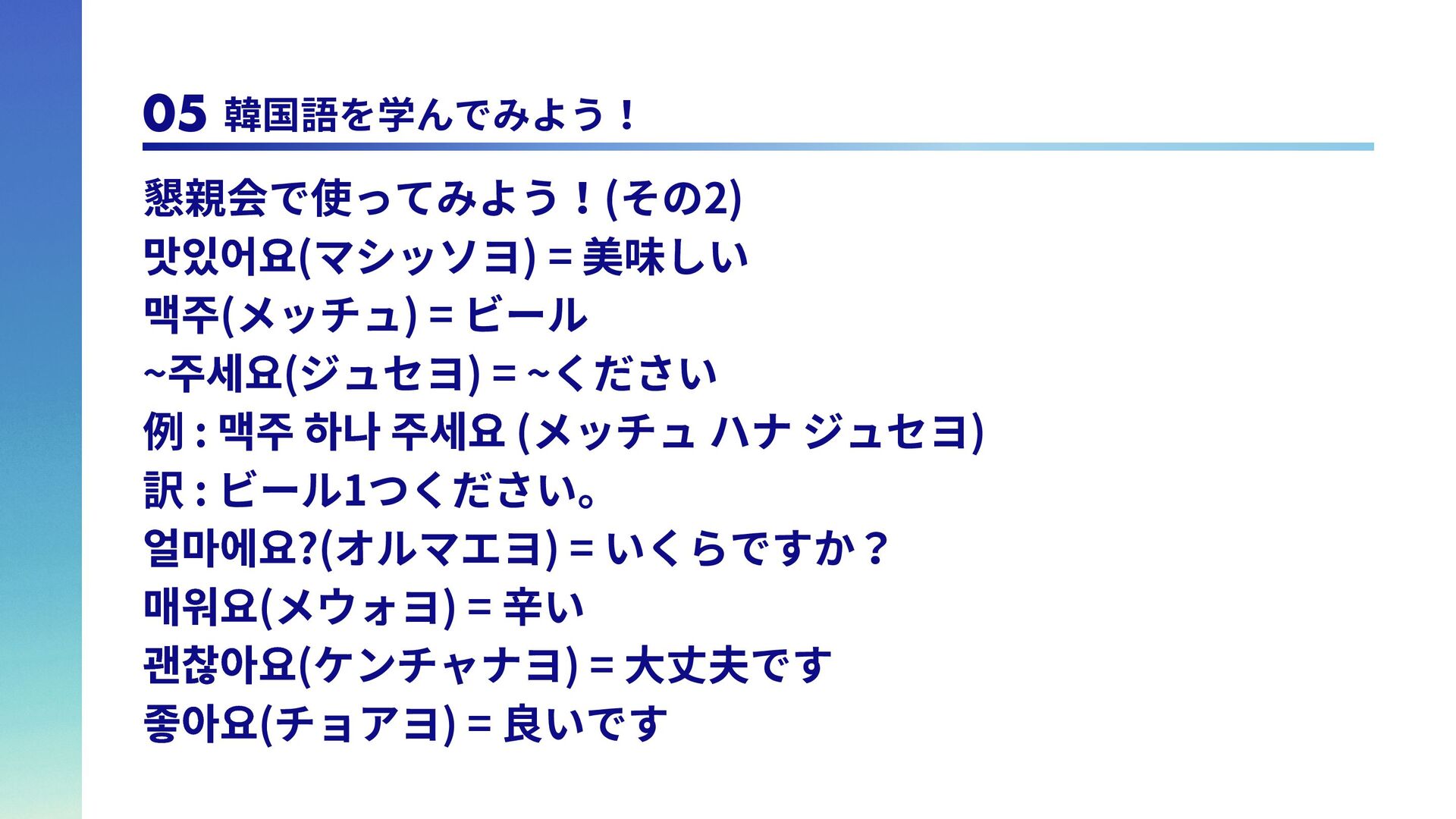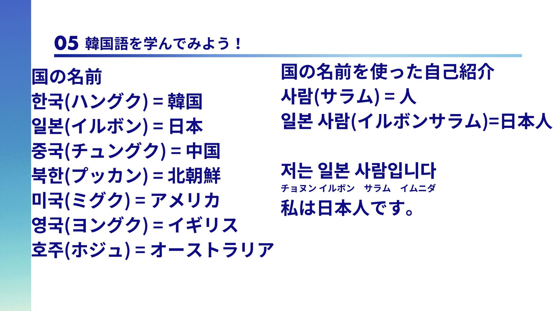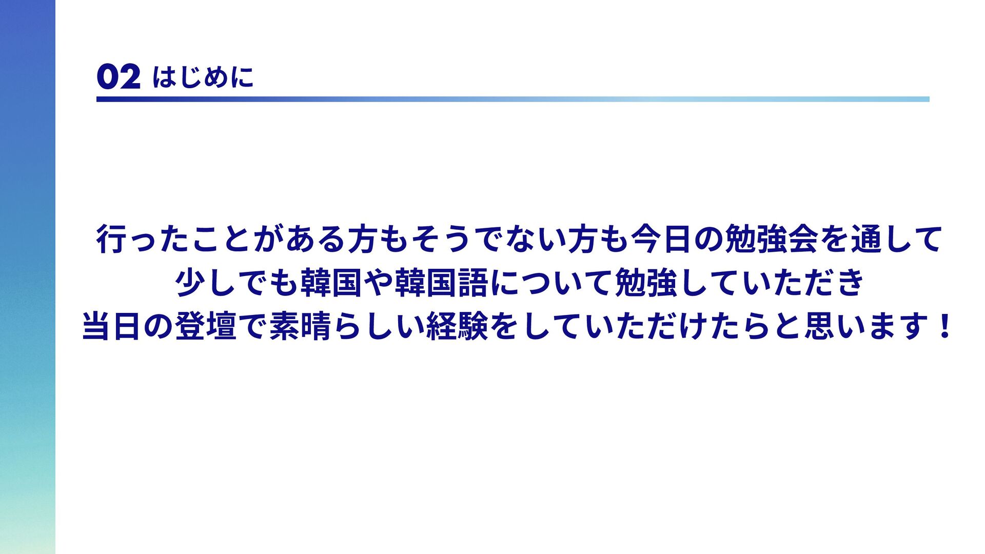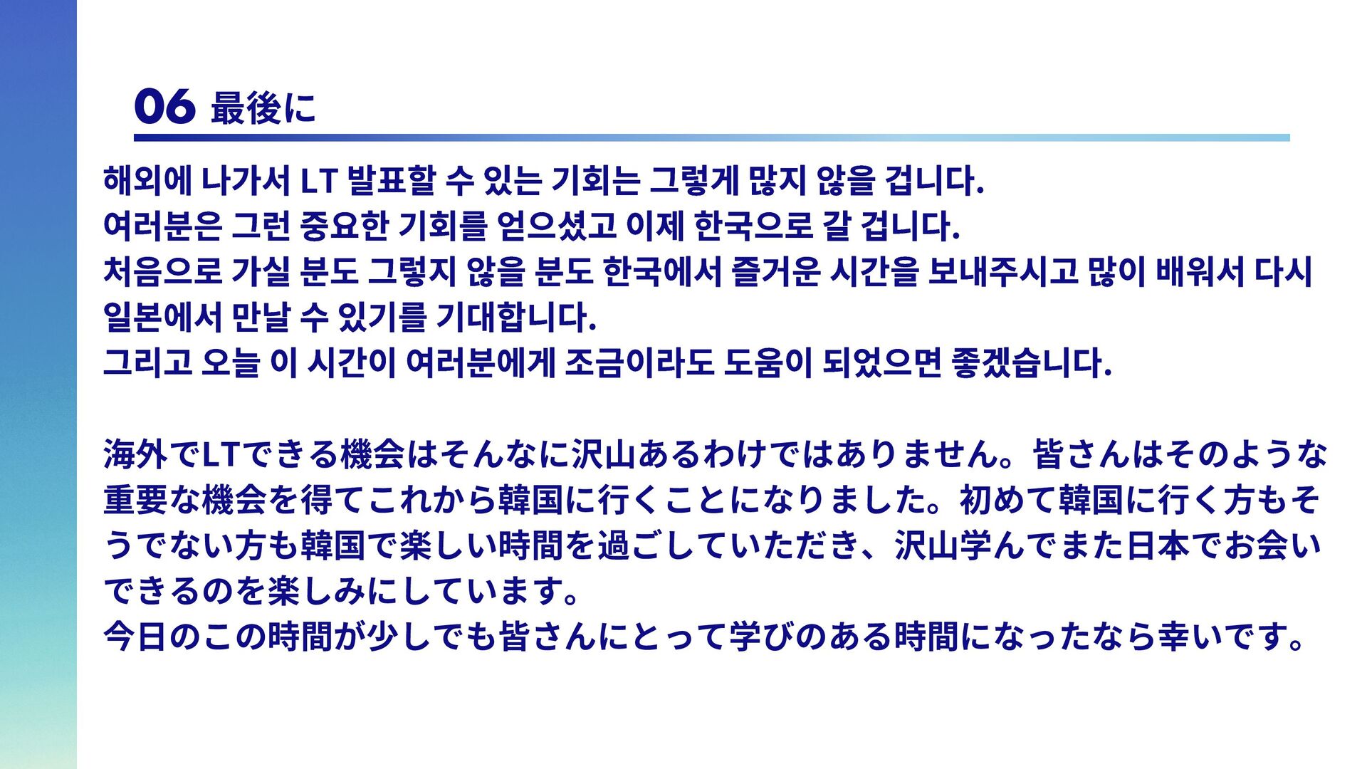 겁니다. 여러분은 그런 중요한 기회를 얻으셨고 이제 한국으로 갈 겁니다. 처음으로 가실 분도 그렇지 않을 분도 한국에서 즐거운 시간을 보내주시고 많이 배워서 다시 일본에서 만날 수 있기를 기대합니다. 그리고 오늘 이 시간이 여러분에게 조금이라도 도움이 되었으면 좋겠습니다. 海外でLTできる機会はそんなに沢山あるわけではありません。皆さんはそのような 重要な機会を得てこれから韓国に行くことになりました。初めて韓国に行く方もそ うでない方も韓国で楽しい時間を過ごしていただき、沢山学んでまた日本でお会い できるのを楽しみにしています。 今日のこの時間が少しでも皆さんにとって学びのある時間になったなら幸いです。 06 最後に