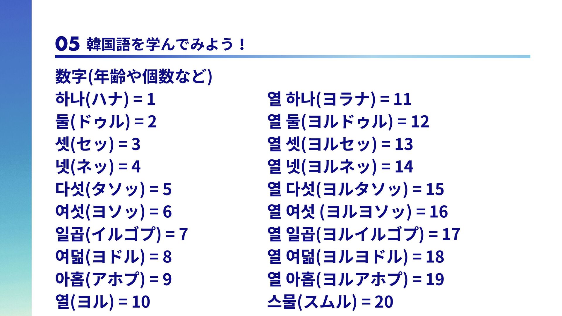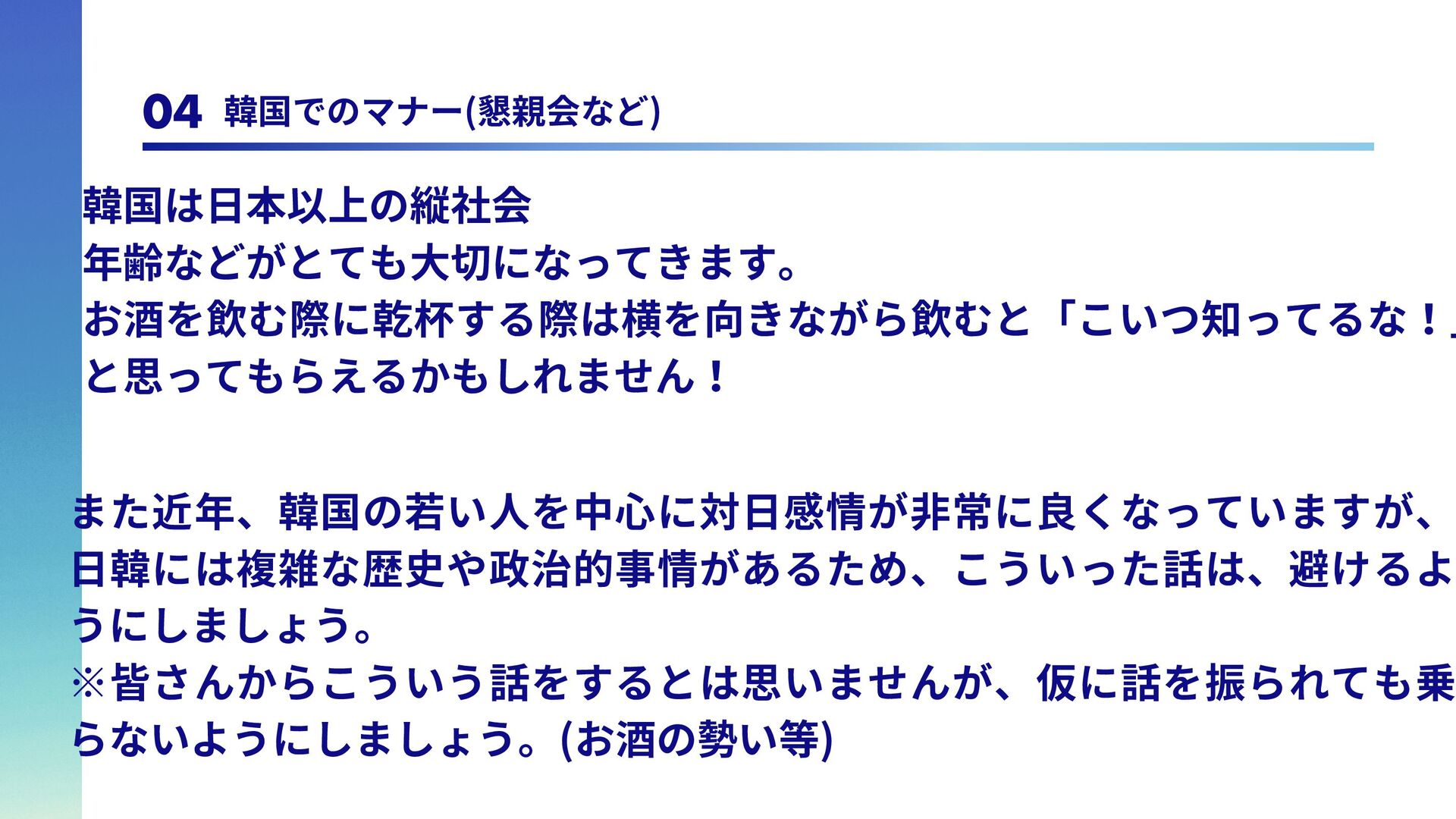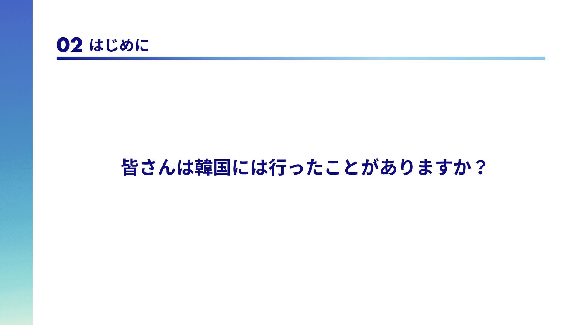 겁니다. 여러분은 그런 중요한 기회를 얻으셨고 이제 한국으로 갈 겁니다. 처음으로 가실 분도 그렇지 않을 분도 한국에서 즐거운 시간을 보내주시고 많이 배워서 다시 일본에서 만날 수 있기를 기대합니다. 그리고 오늘 이 시간이 여러분에게 조금이라도 도움이 되었으면 좋겠습니다. 海外でLTできる機会はそんなに沢山あるわけではありません。皆さんはそのような 重要な機会を得てこれから韓国に行くことになりました。初めて韓国に行く方もそ うでない方も韓国で楽しい時間を過ごしていただき、沢山学んでまた日本でお会い できるのを楽しみにしています。 今日のこの時間が少しでも皆さんにとって学びのある時間になったなら幸いです。 06 最後に