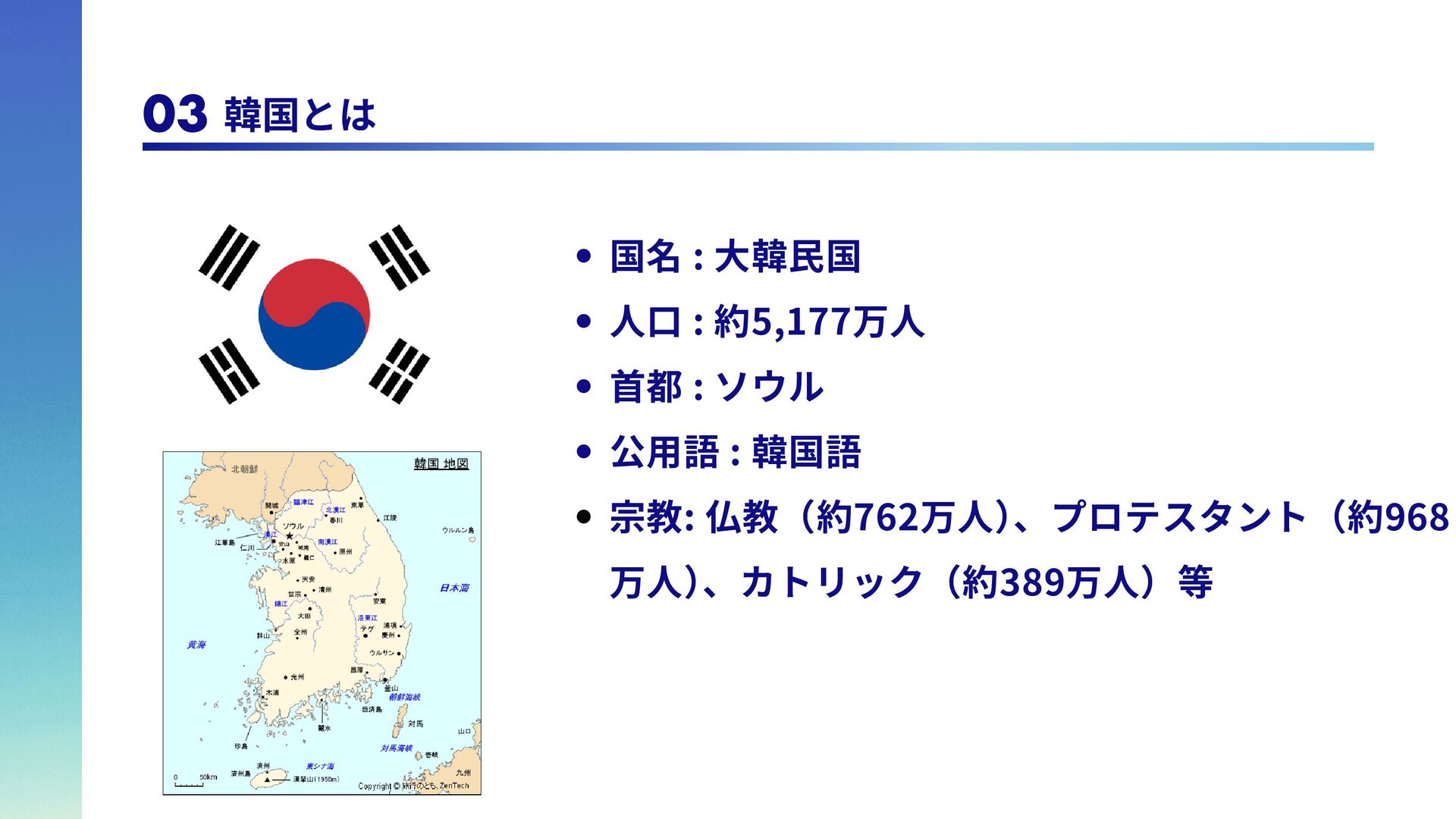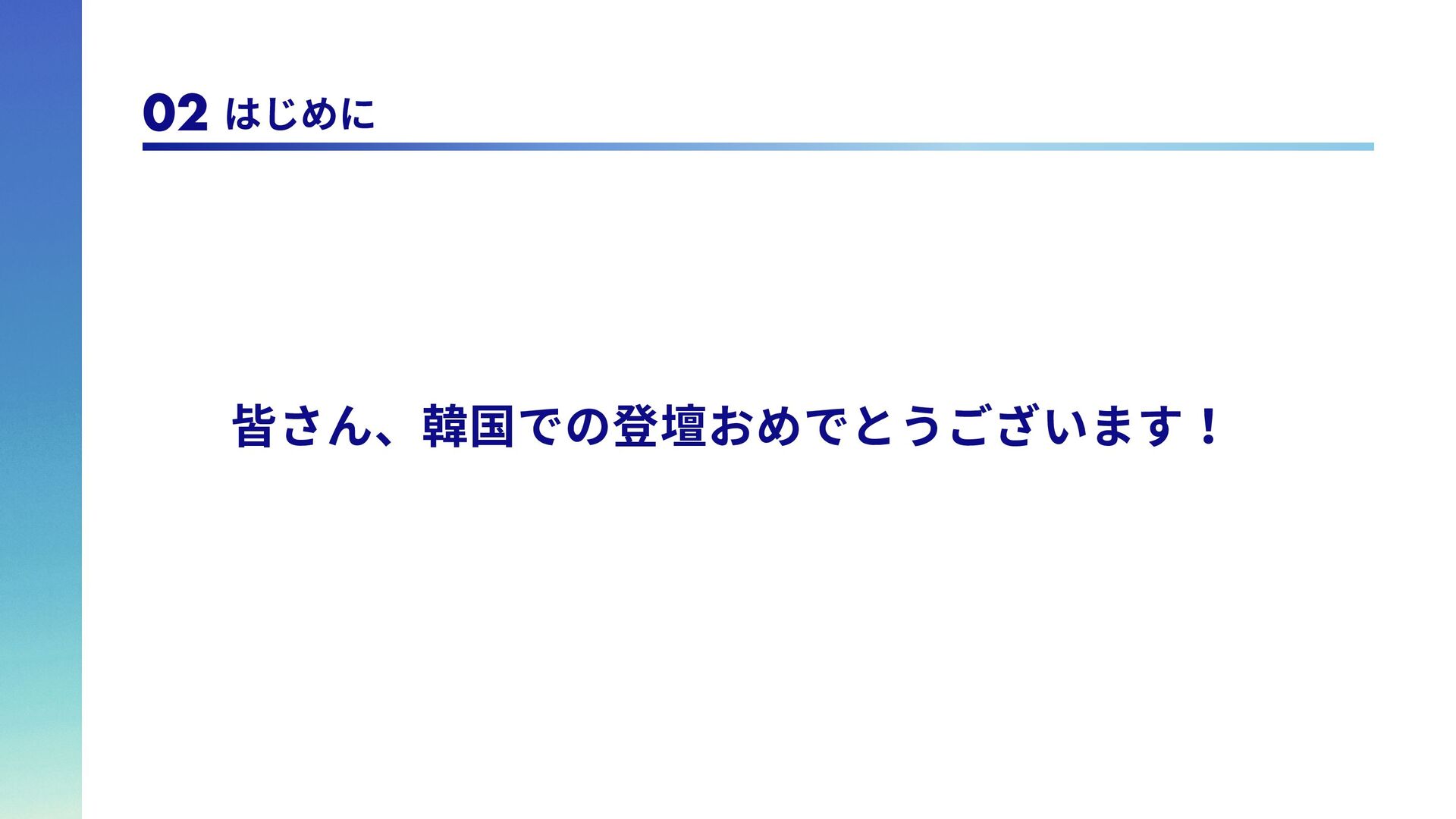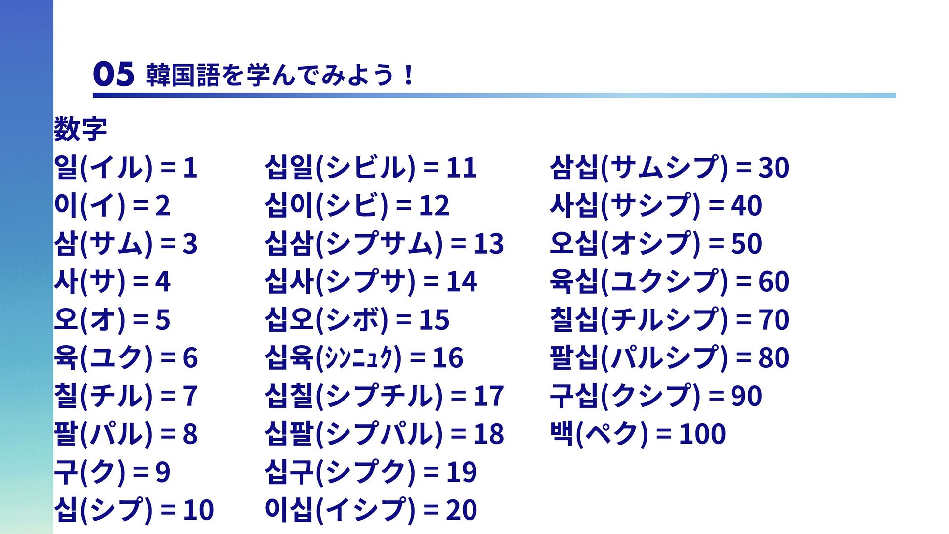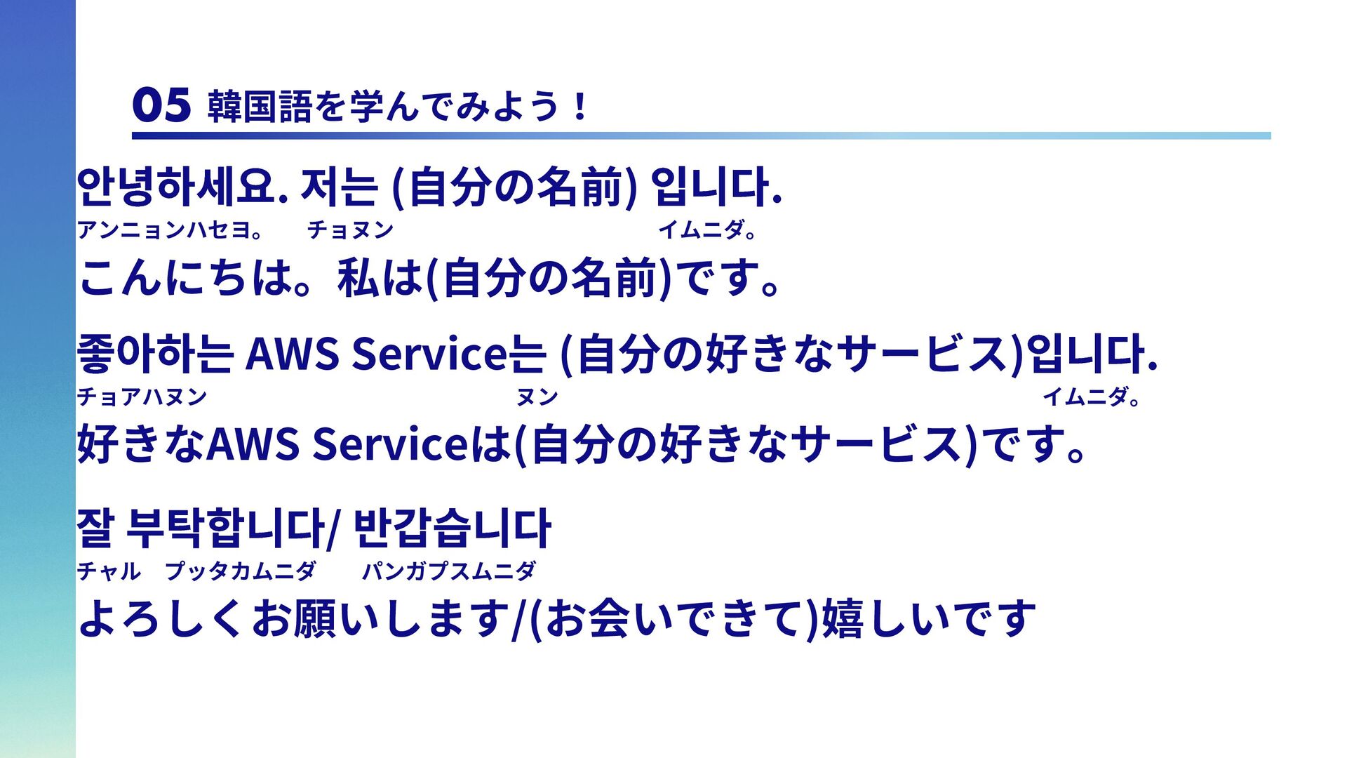 겁니다. 여러분은 그런 중요한 기회를 얻으셨고 이제 한국으로 갈 겁니다. 처음으로 가실 분도 그렇지 않을 분도 한국에서 즐거운 시간을 보내주시고 많이 배워서 다시 일본에서 만날 수 있기를 기대합니다. 그리고 오늘 이 시간이 여러분에게 조금이라도 도움이 되었으면 좋겠습니다. 海外でLTできる機会はそんなに沢山あるわけではありません。皆さんはそのような 重要な機会を得てこれから韓国に行くことになりました。初めて韓国に行く方もそ うでない方も韓国で楽しい時間を過ごしていただき、沢山学んでまた日本でお会い できるのを楽しみにしています。 今日のこの時間が少しでも皆さんにとって学びのある時間になったなら幸いです。 06 最後に