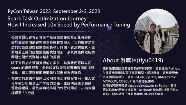 在這次的演講中我將以公司某項工作排程為例,和大家分享我分析這項工作排程的思路,並說明我逐步測試、優化的過程,最終成功將排程的執行時間從 5 小時大幅縮短至 30 分鐘