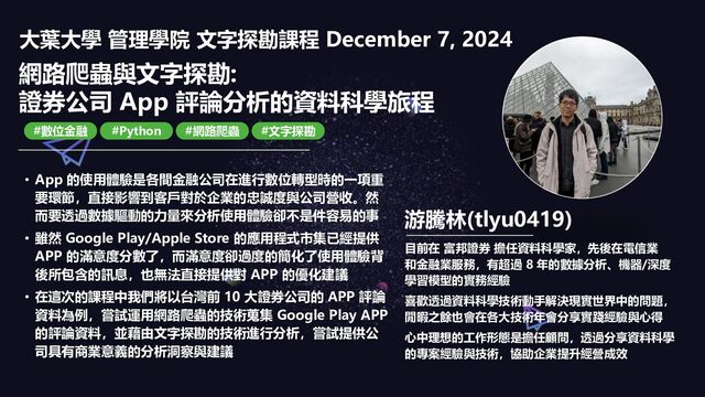 在這次的課程中我們將以台灣前 10 大證券公司的 APP 評論資料為例,嘗試運用網路爬蟲的技術蒐集 Google Play APP 的評論資料,並藉由文字探勘的技術進行分析,嘗試提供公司具有商業意義的分析洞察與建議