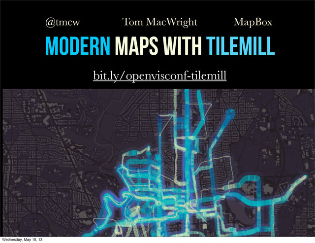 Modern Maps with TileMill Tom MacWright MapBox @tmcw bit.ly/openvisconf-tilemill Wednesday,