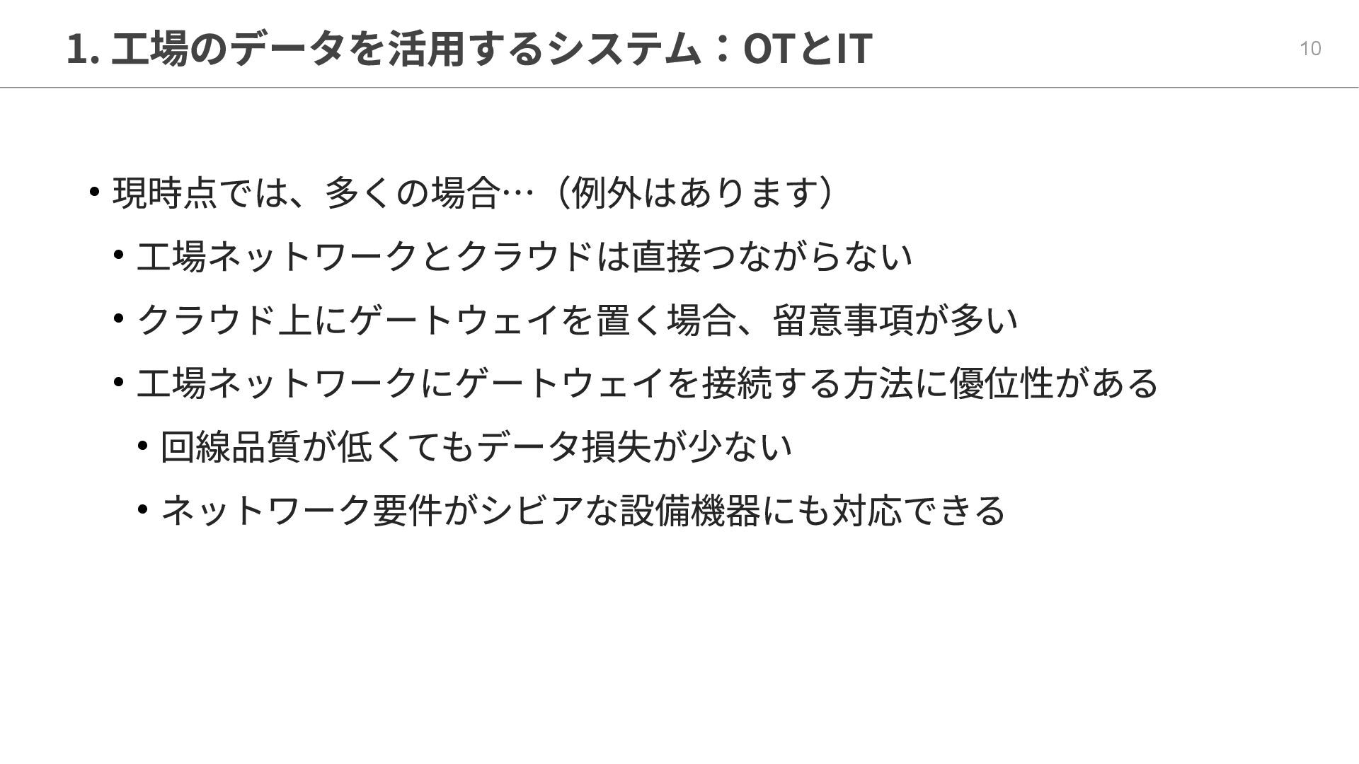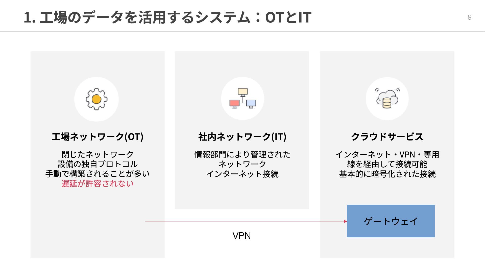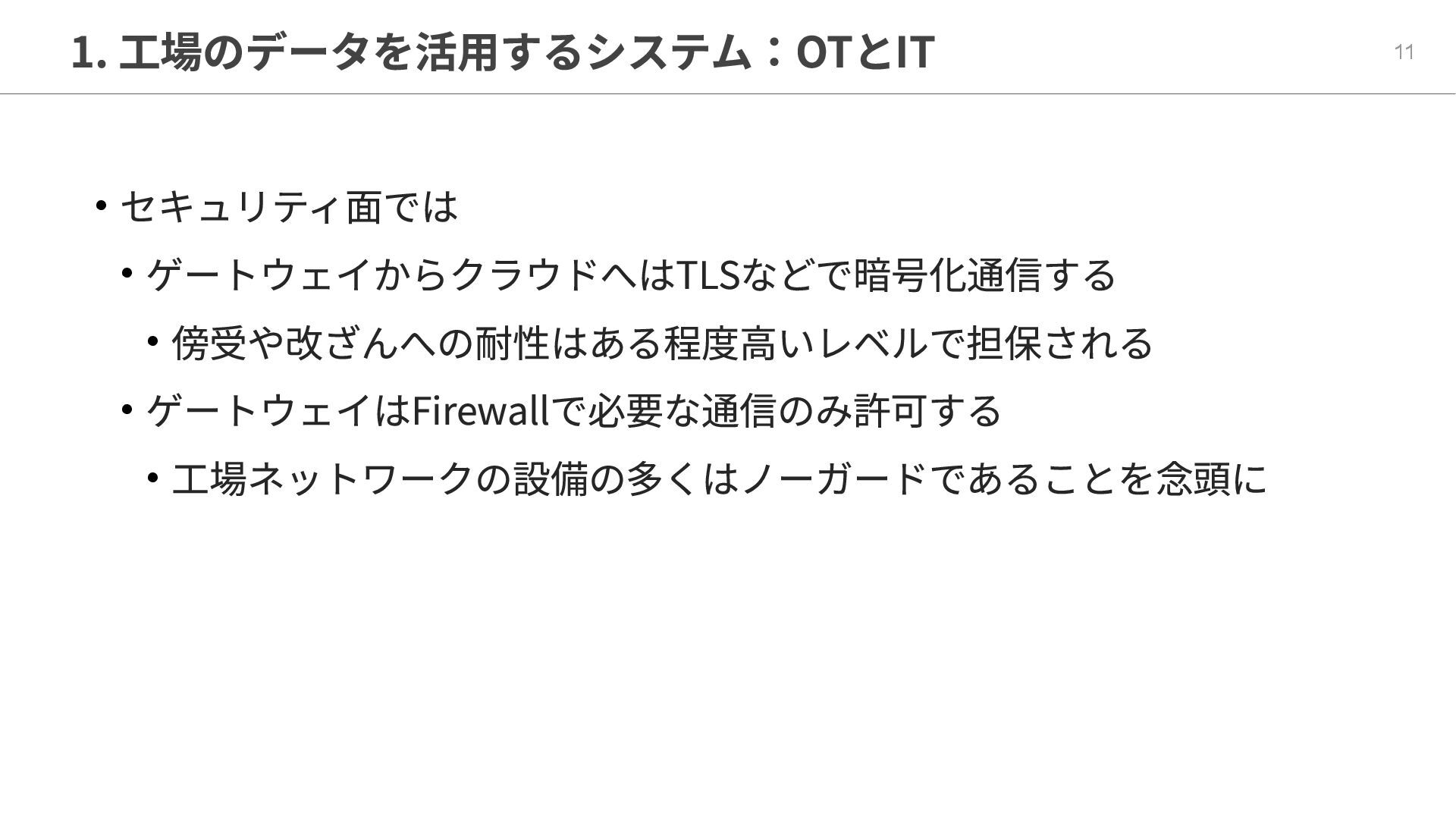 9. 1. 工場のデータを活用するシステム:OTとIT 11  セキュリティ面では  ゲートウェイからクラウドへはTLSなどで暗号化通信する  傍受や改ざんへの耐性はある程度高いレ ベルで